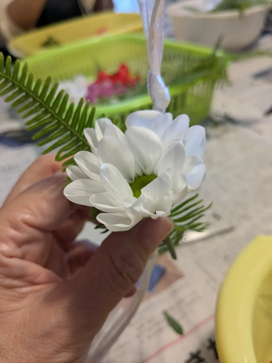 軸になる葉っぱは先生が持って来るのを忘れたのでビニール紐で代用😅