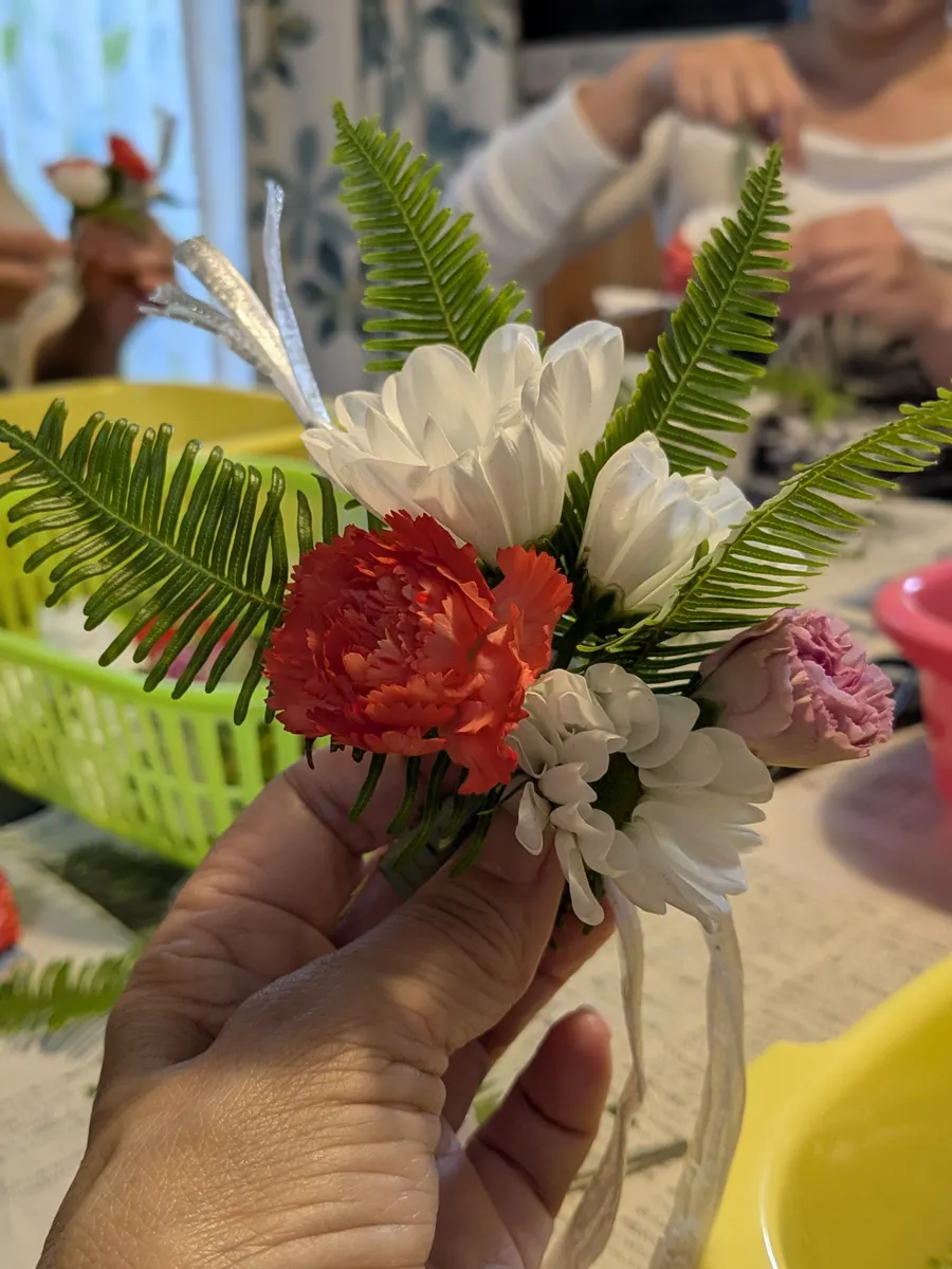 1本を軸にして葉っぱ、お花を置いて2本で巻いて止めていきます。