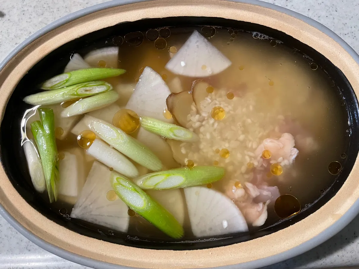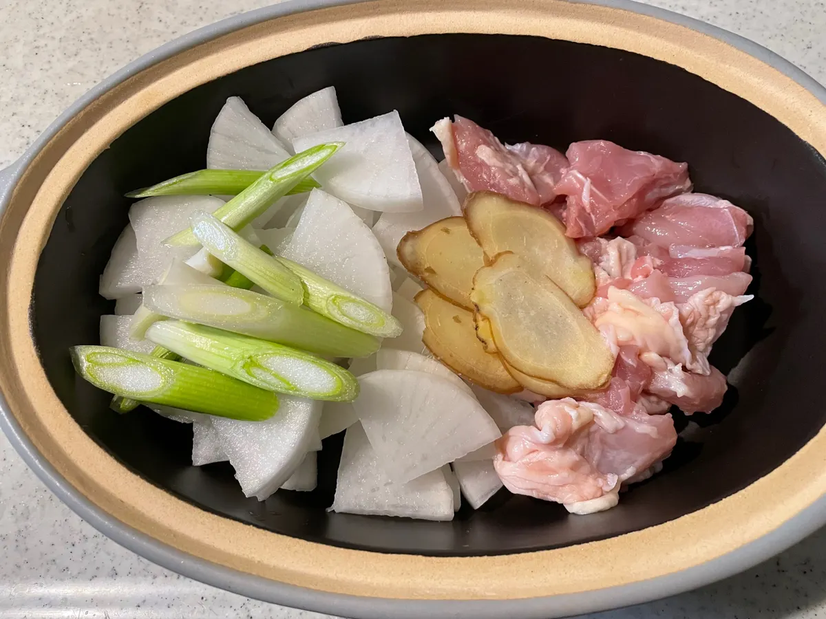 パスタポットにカットした鶏もも肉 大根 長ネギを入れる