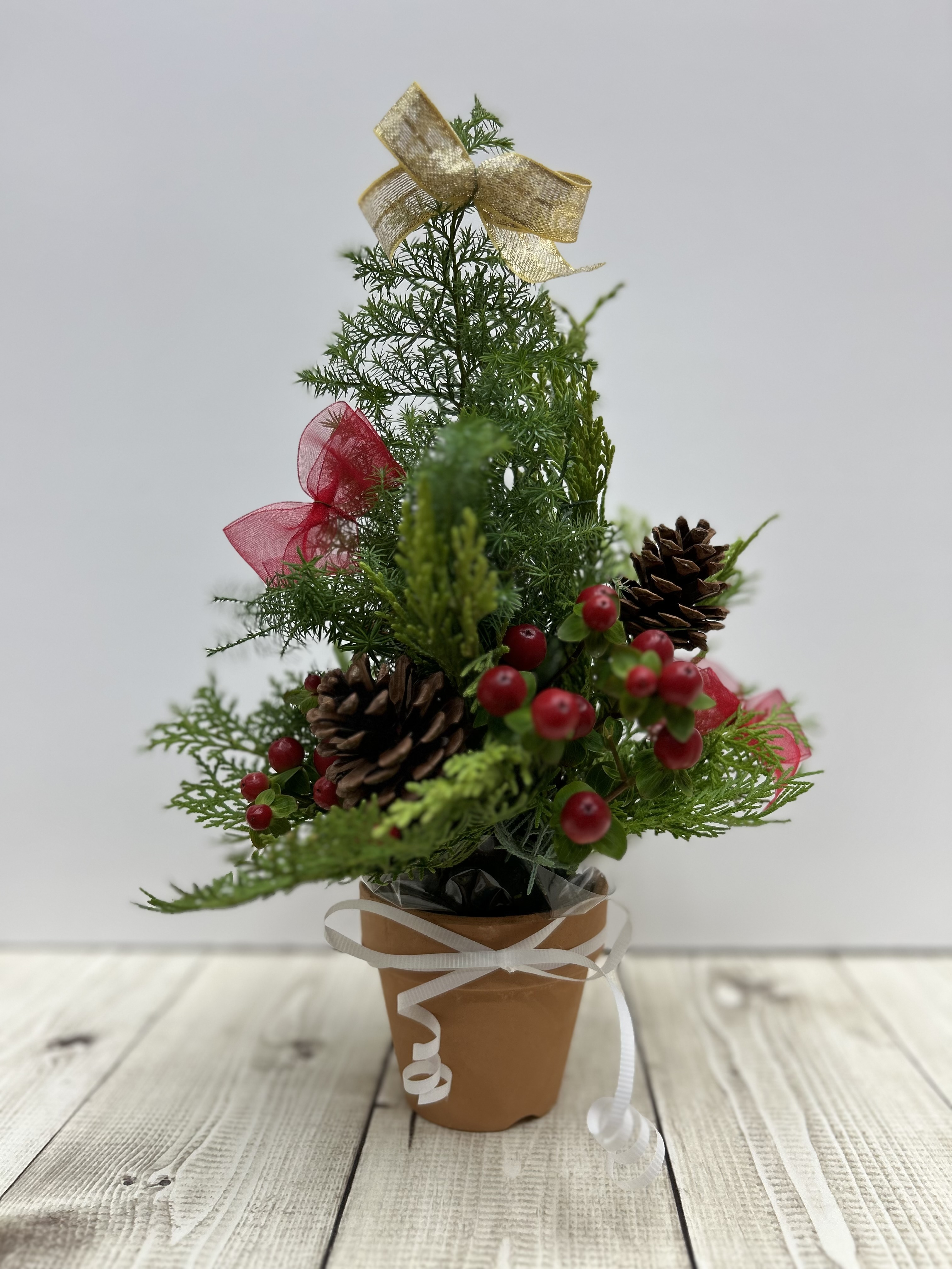 ヒムロヒバ、クジャクヒバ,ブルーアイス、で円すいを作りました。ピペリカムの赤い実が可愛いです。マツカサ,リボンを添えました。