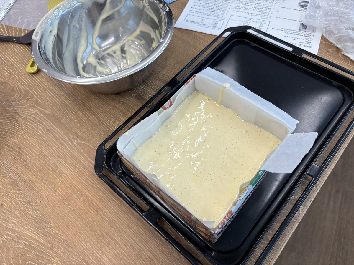 新聞紙で型箱を作って、クックパーを入れた中にカステラ生地を流し込み。