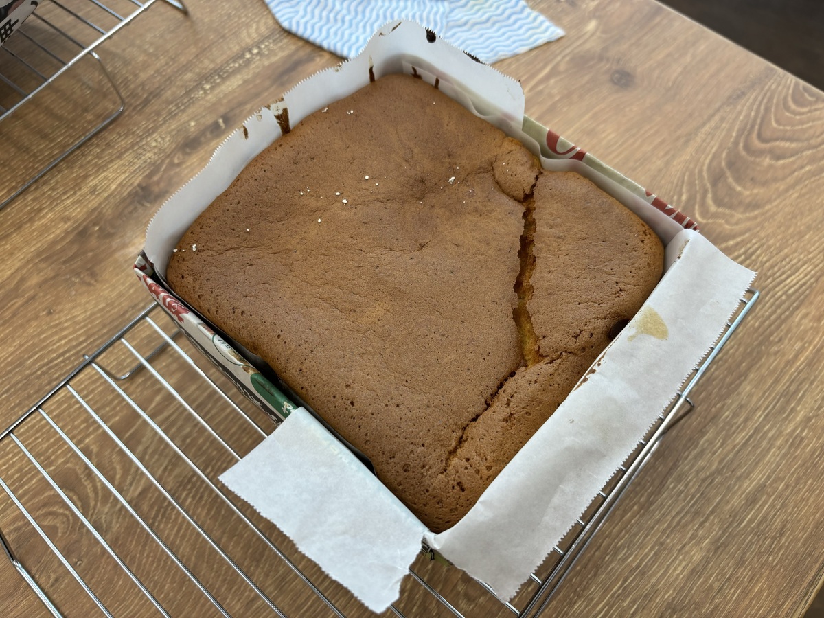真ん中が凹んできた感じなので型ごとひっくる返して粗熱をとる。