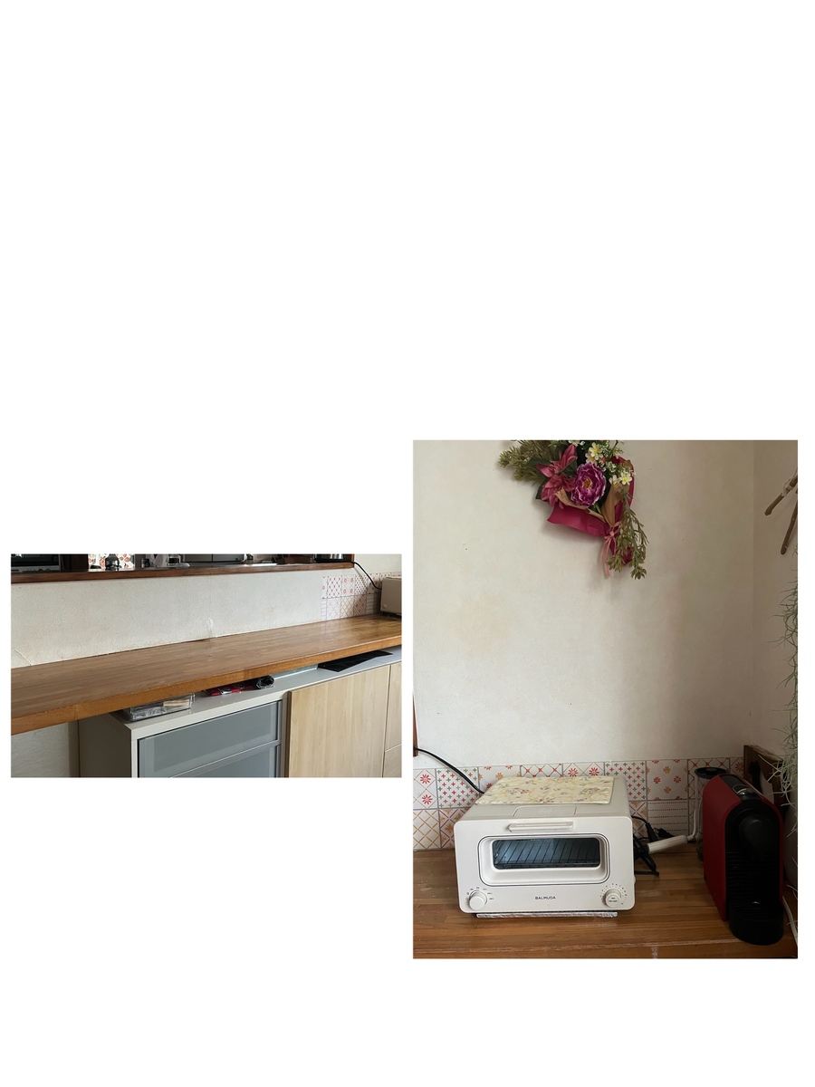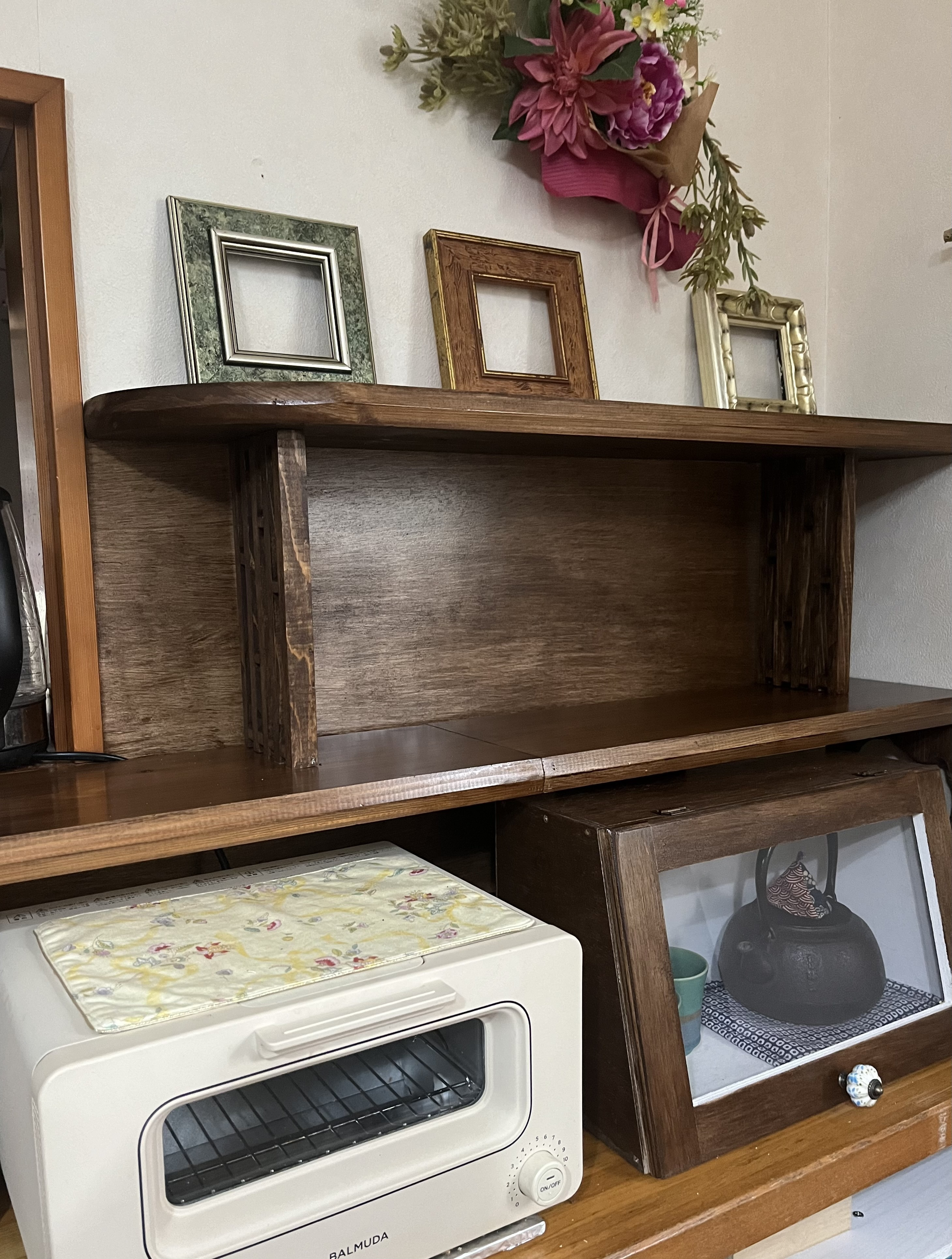 トースターの上にもう一段の棚を、そしてカウンターを広く使いやすく!とリクエスト。