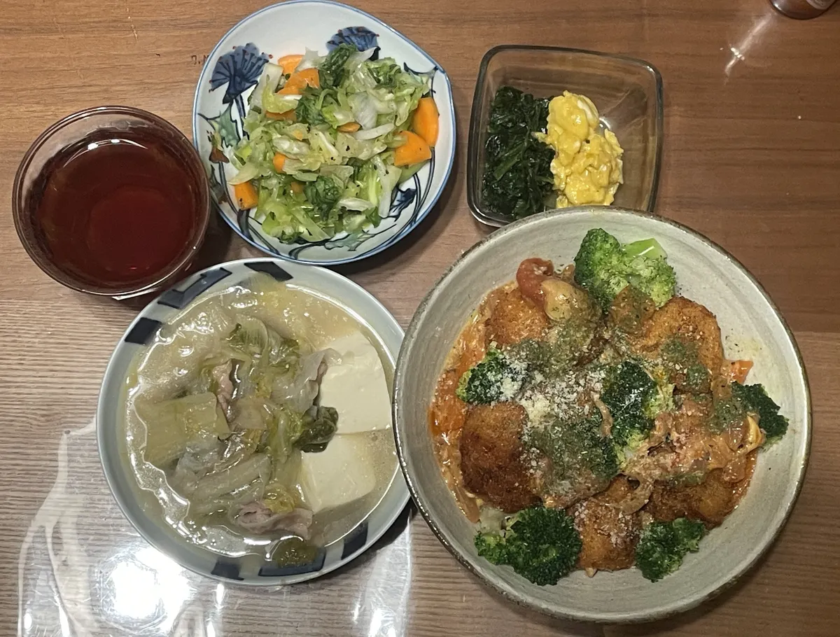 ピクルス風サラダ・繋ぎもののほうれん草のバタークレソル炒め&とろとろスクランブルエッグ・繋ぎものの豚バラ白菜葱のダシダ煮&絹豆腐・チキンカツのトマトピザ風丼✨