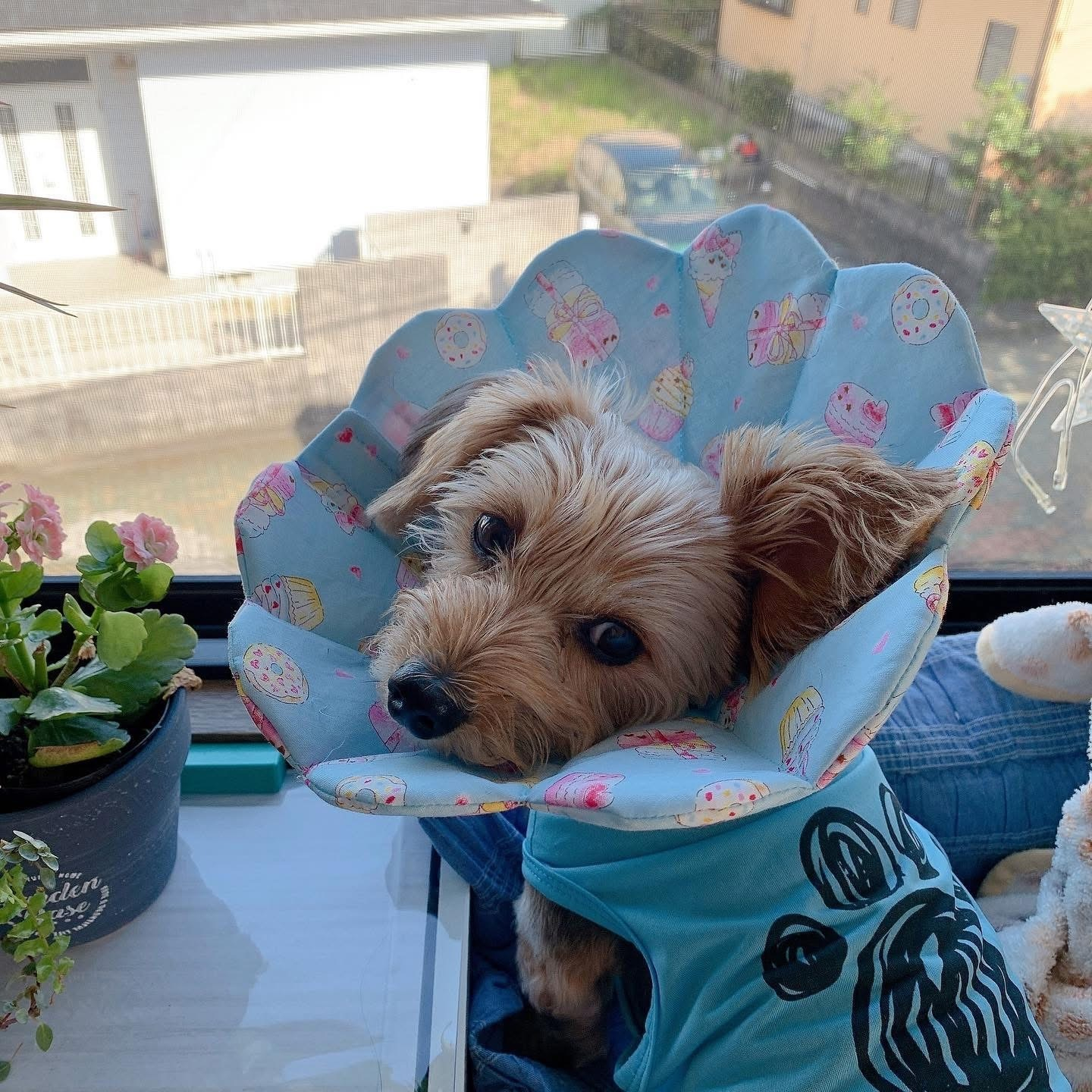 オシャレなエリザベスカラーでしかも布で手作りしてくれて優しさ沢山ですね💕︎