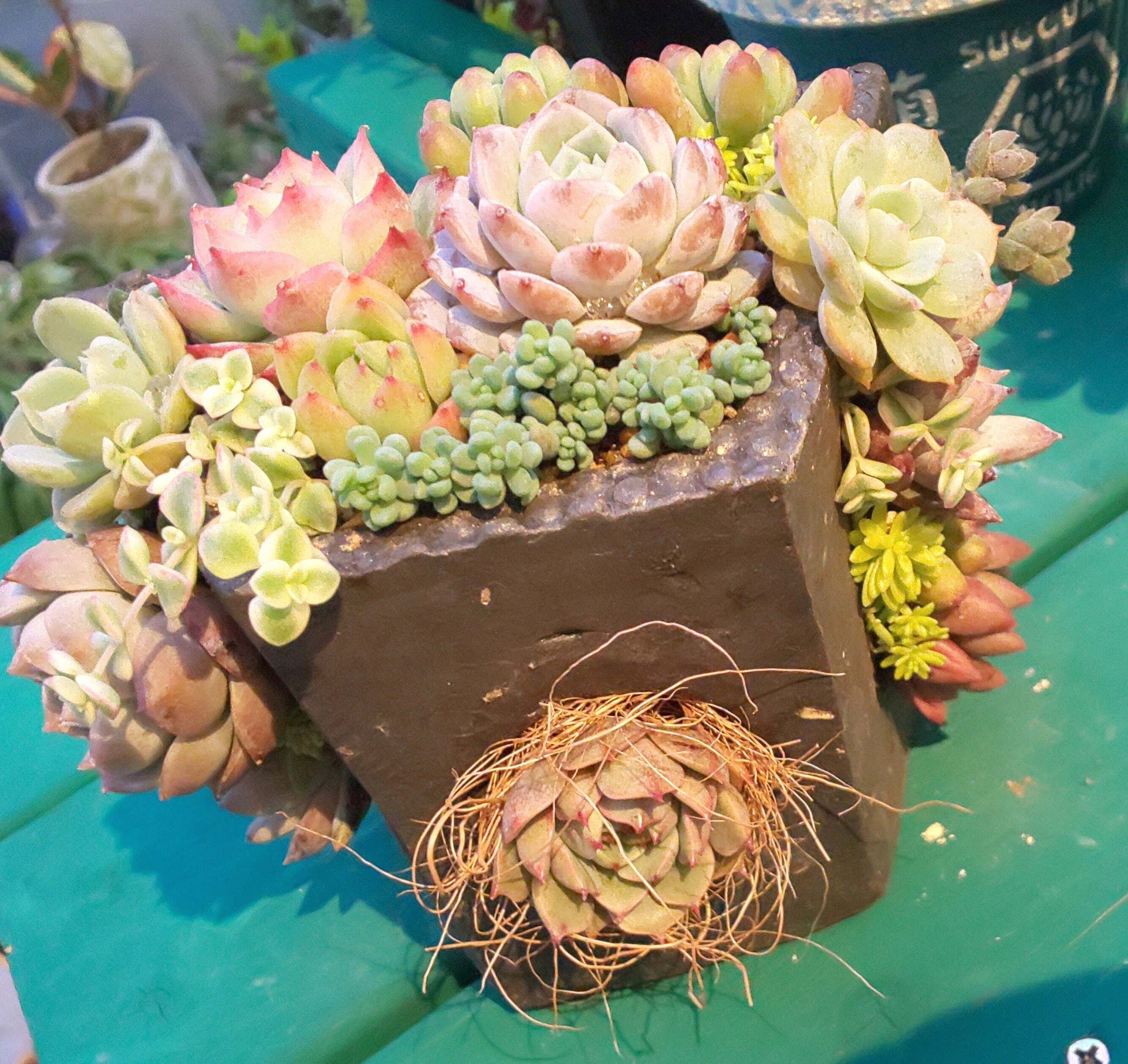 スリットに苗とのスキマが出来ちゃうと苗が下に落ちちゃうので、モサモサ〜っとしたセダムを枕に入れて上げると安定しやすいよ♥