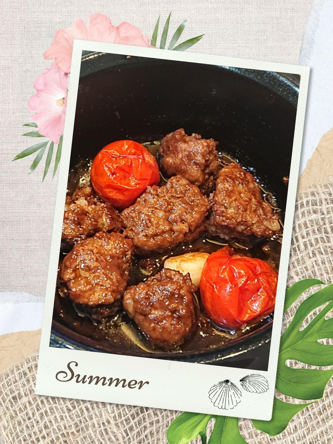 スーパーで買った生ハンバーグを6つにカットしたら、オリーブオイルを温めた小鍋にニンニクと一緒に入れて焦げ目がつく位まで焼きます。次に赤ワインとケチャップを入れて煮込みます。最後に冷凍ミニトマトとローリエ(粉末)を入れてさらに煮込んだら出来上がり♪です🤗