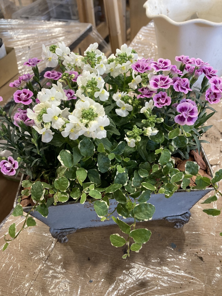 脚付きブリキのダイアンサス寄せ植え、でした。多年草なので、夏になくなってもお手入れすればまた咲いてくれるとのこと!枯らしの達人なんだけど、咲かせられるかなぁ笑