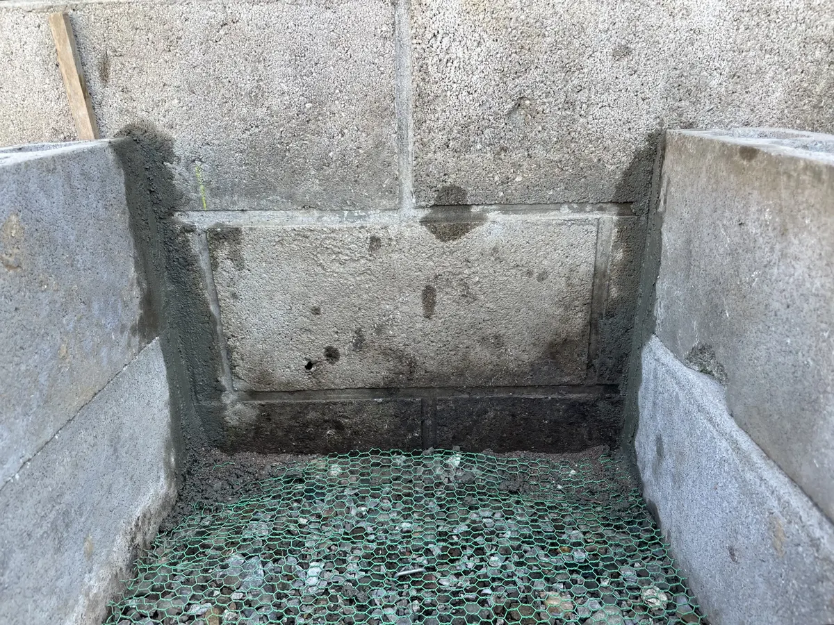 ↓背面のブロック塀と重量ブロックの間にできた隙間をモルタルで埋めました。