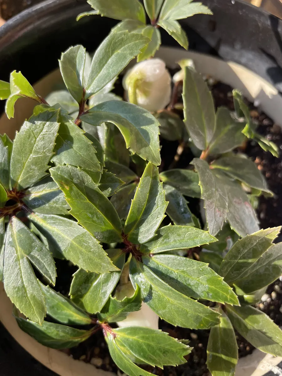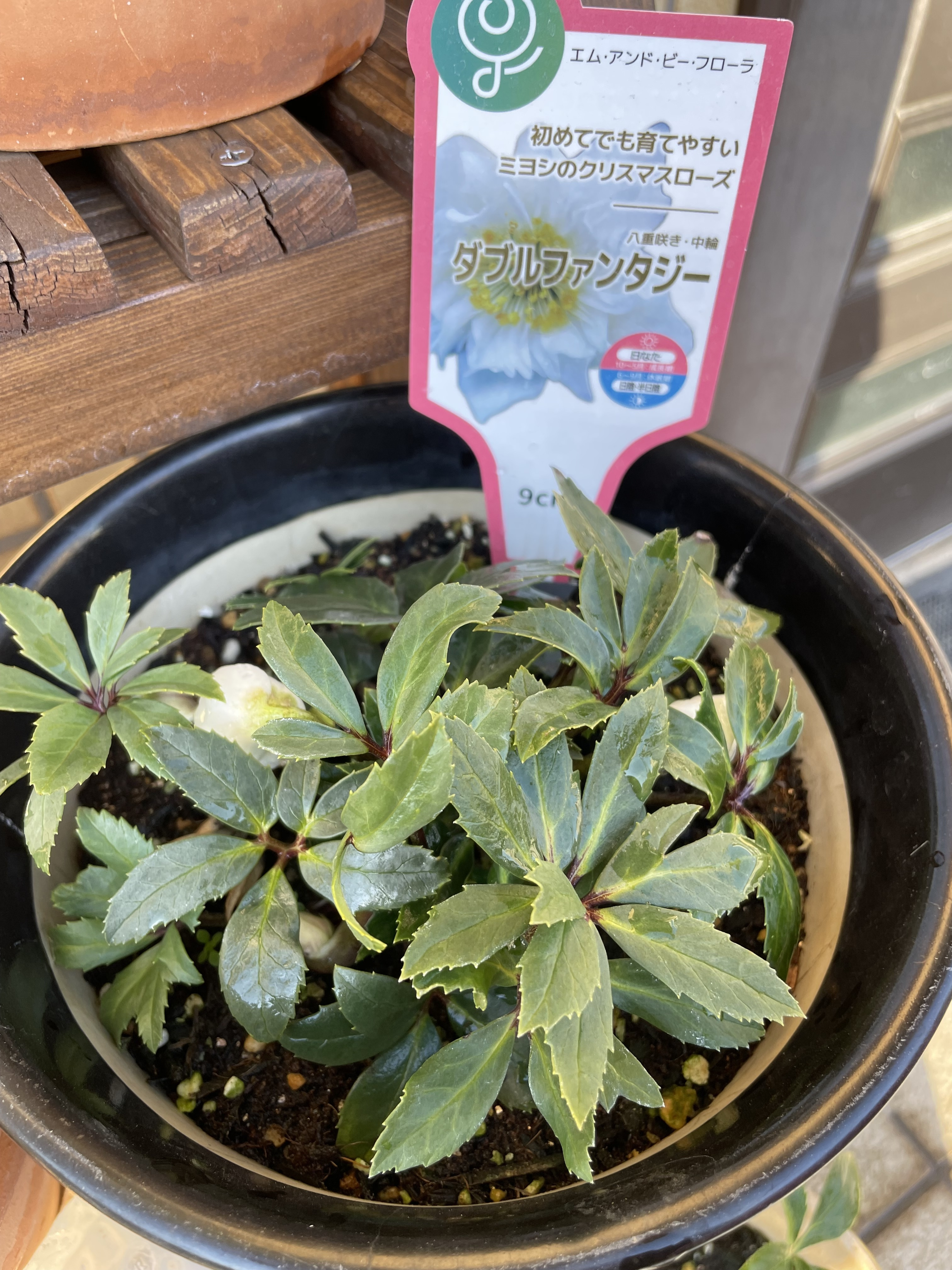 昨年11月に買ってきて鉢上げしたクリスマスローズ(リンク→ https://diy-square.cainz.com/announcements/i8cbnlmpgklllbox ) 2種のうち、ダブルファンタジーに白い蕾が付きはじめました。