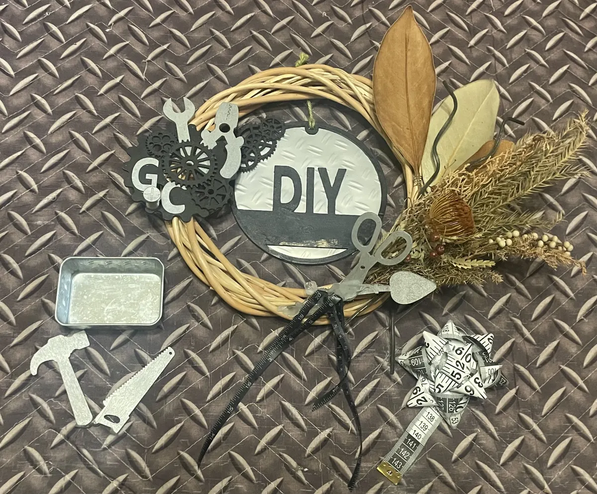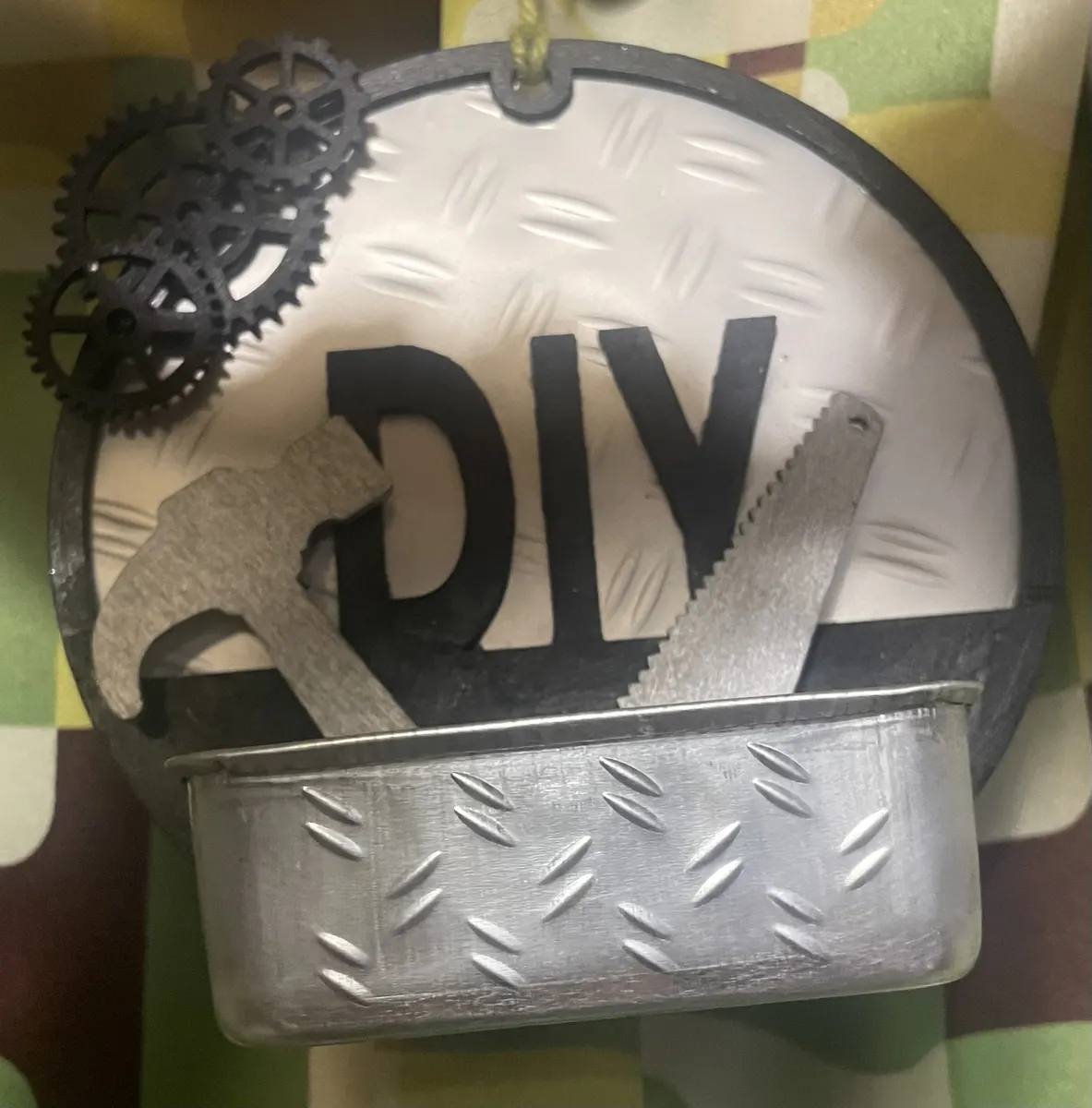 縞鋼板背景にしたDIYプレートに縞鋼板缶ケースに入れたハンドツールパーツが立体感あってお気に入りぃ〜😆🙌🏁⭕️🛠️✨