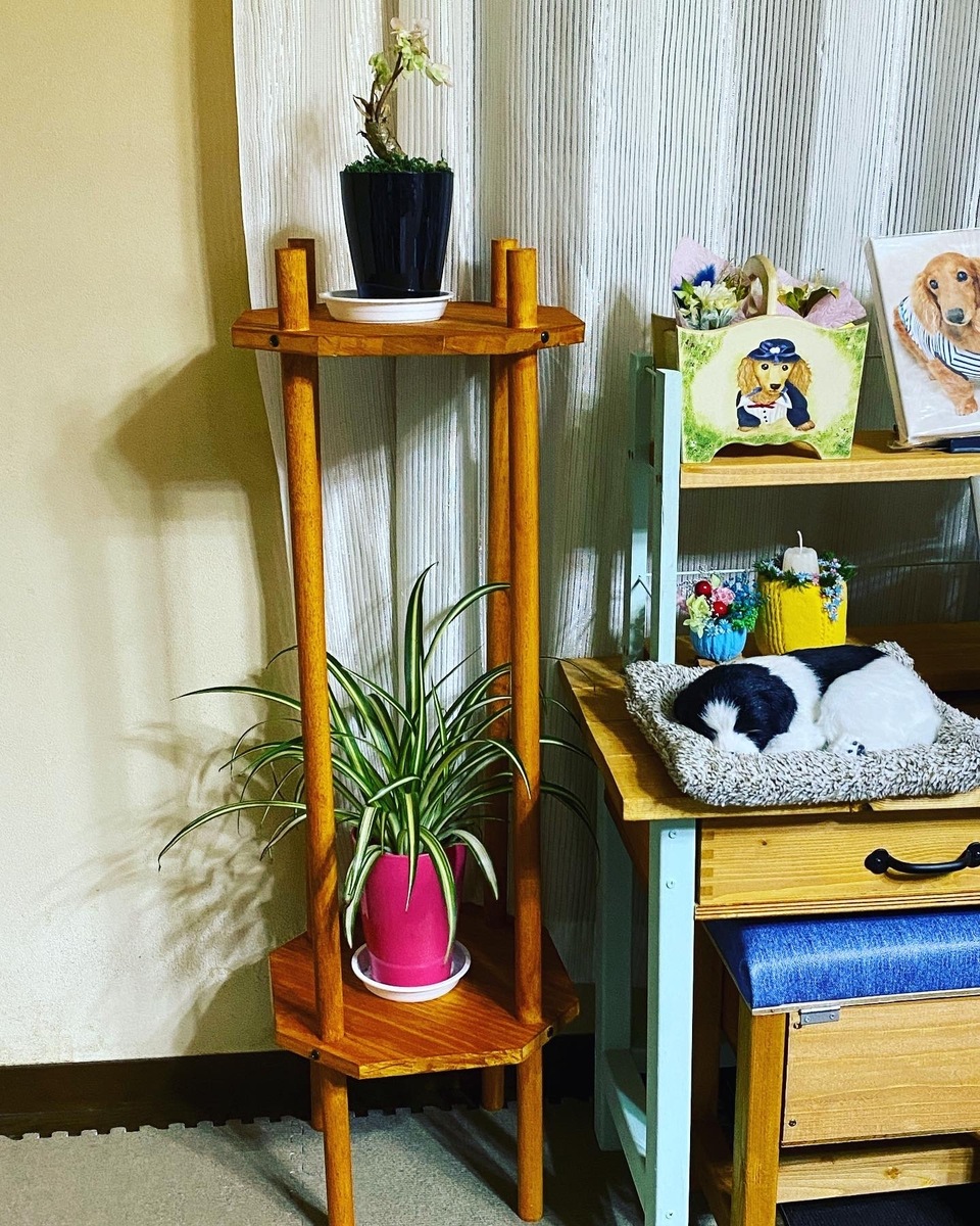 早速自宅でとりあえず、オリジナルランと桜ベゴニア🌸を飾りました。WSで作ったサイドテーブルと、キッチン栽培ラックのお隣に鎮座してもらいました。😅また、時間が出来たらステンシルもしてみようかな。ヾ(๑╹◡╹)ノ"