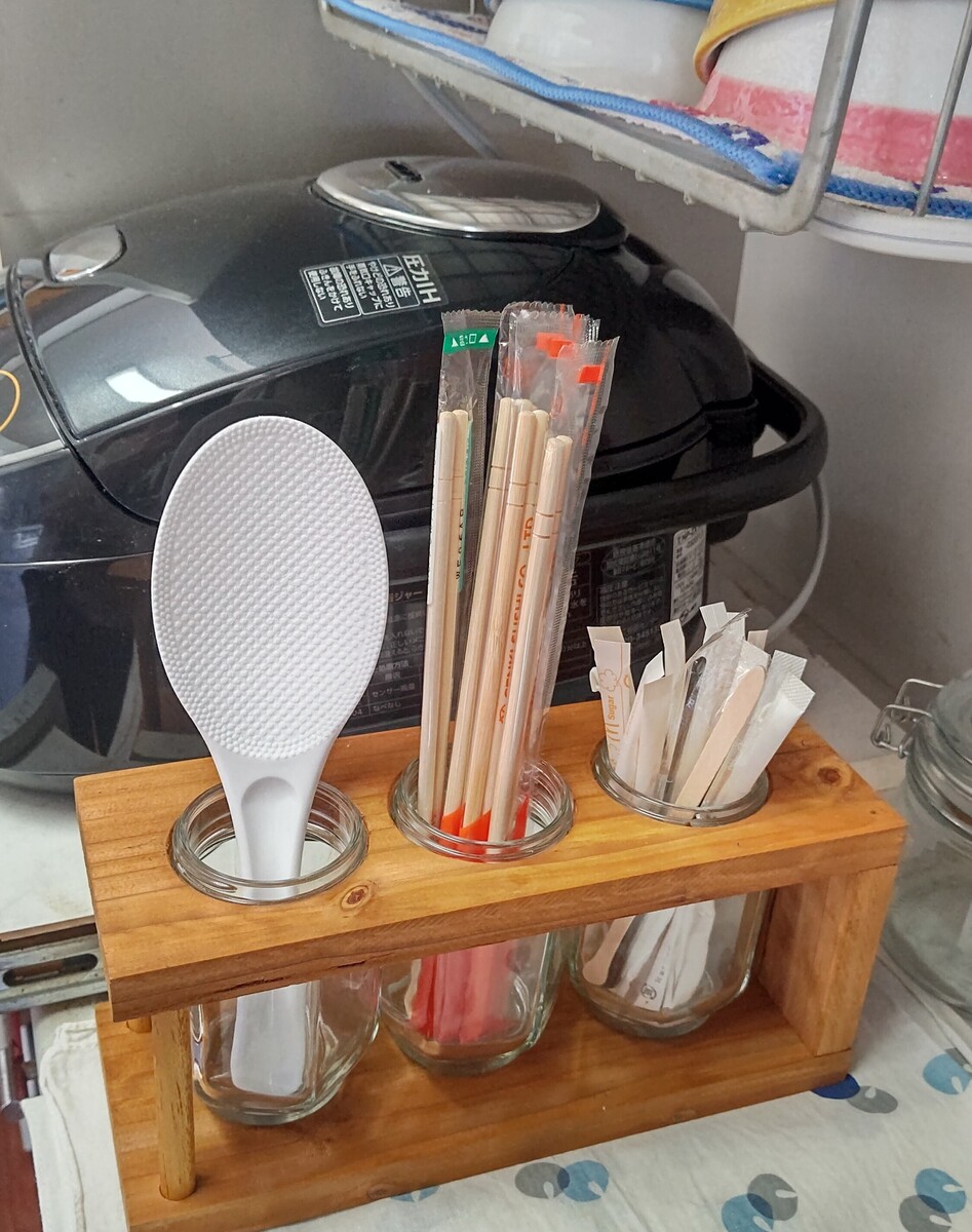 とりあえず、しゃもじを湯呑みに入れてたので、瓶ホルダーにイン。