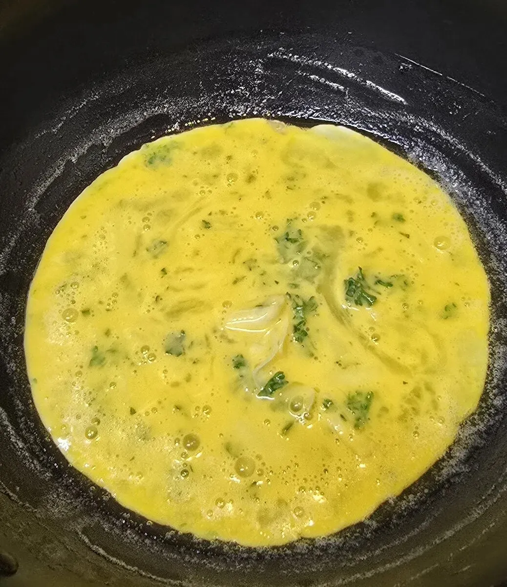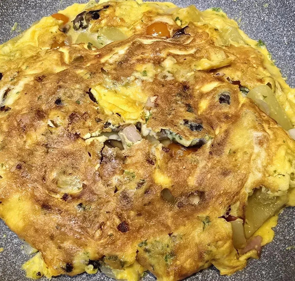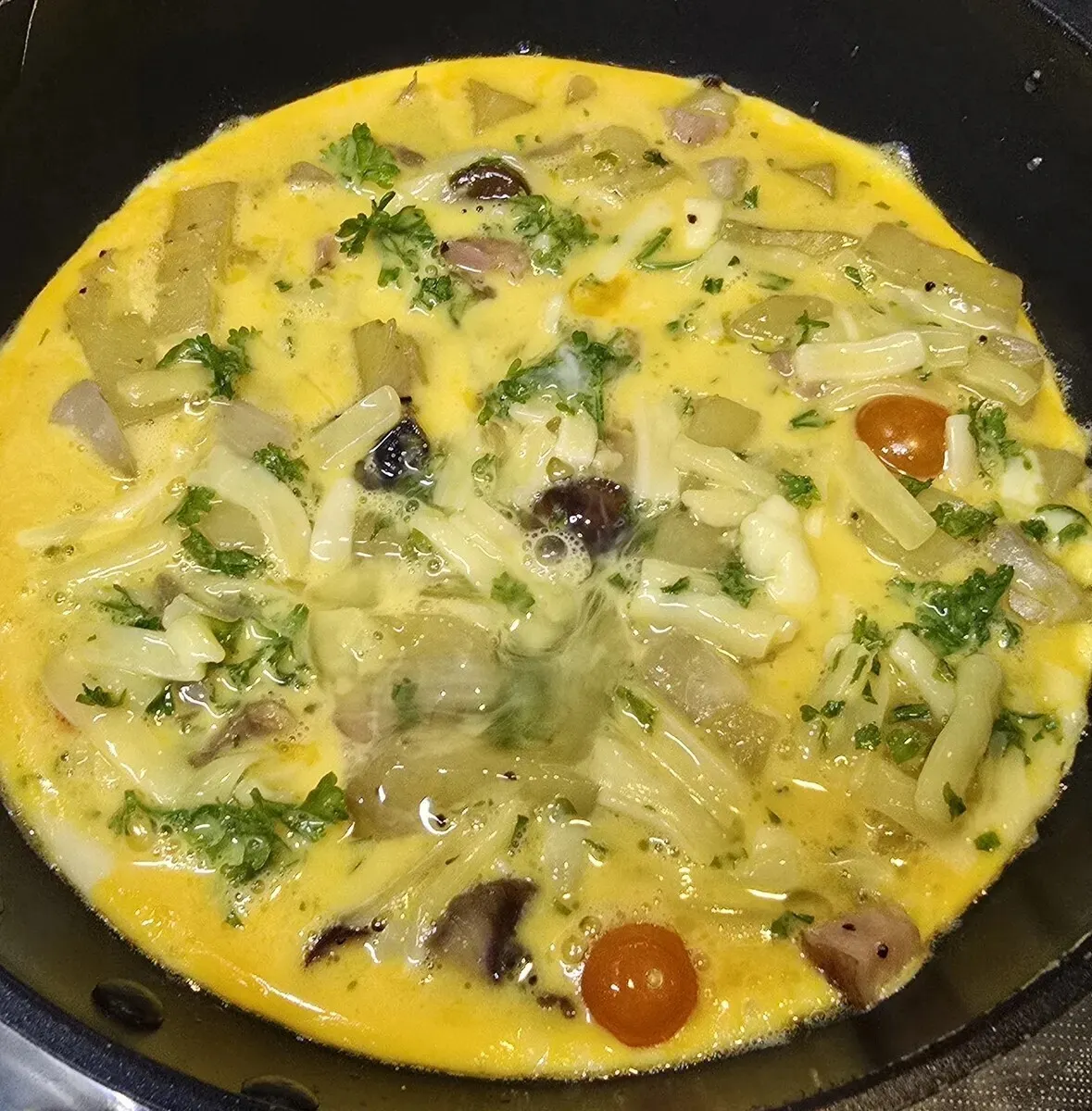 反省点は、卵のサイズが小さかったので 3個に増やすか、具材を減らすかすればよかったナという点と、フライパンのチョイスも直径小さめで深さがあるものにすればよかったナという点です📝