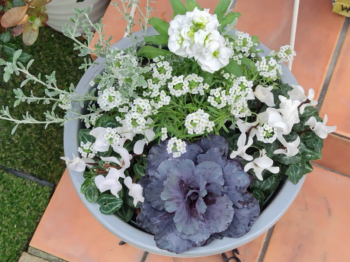 ブラックフライデーに合わせて作られた?良い色です。白やプラチナとよく合って可愛い寄せ植えですね。