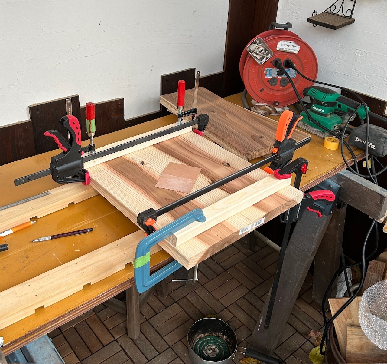 カフェ板の端材は4枚あるので、まず2枚づつくっつけて棚板にします