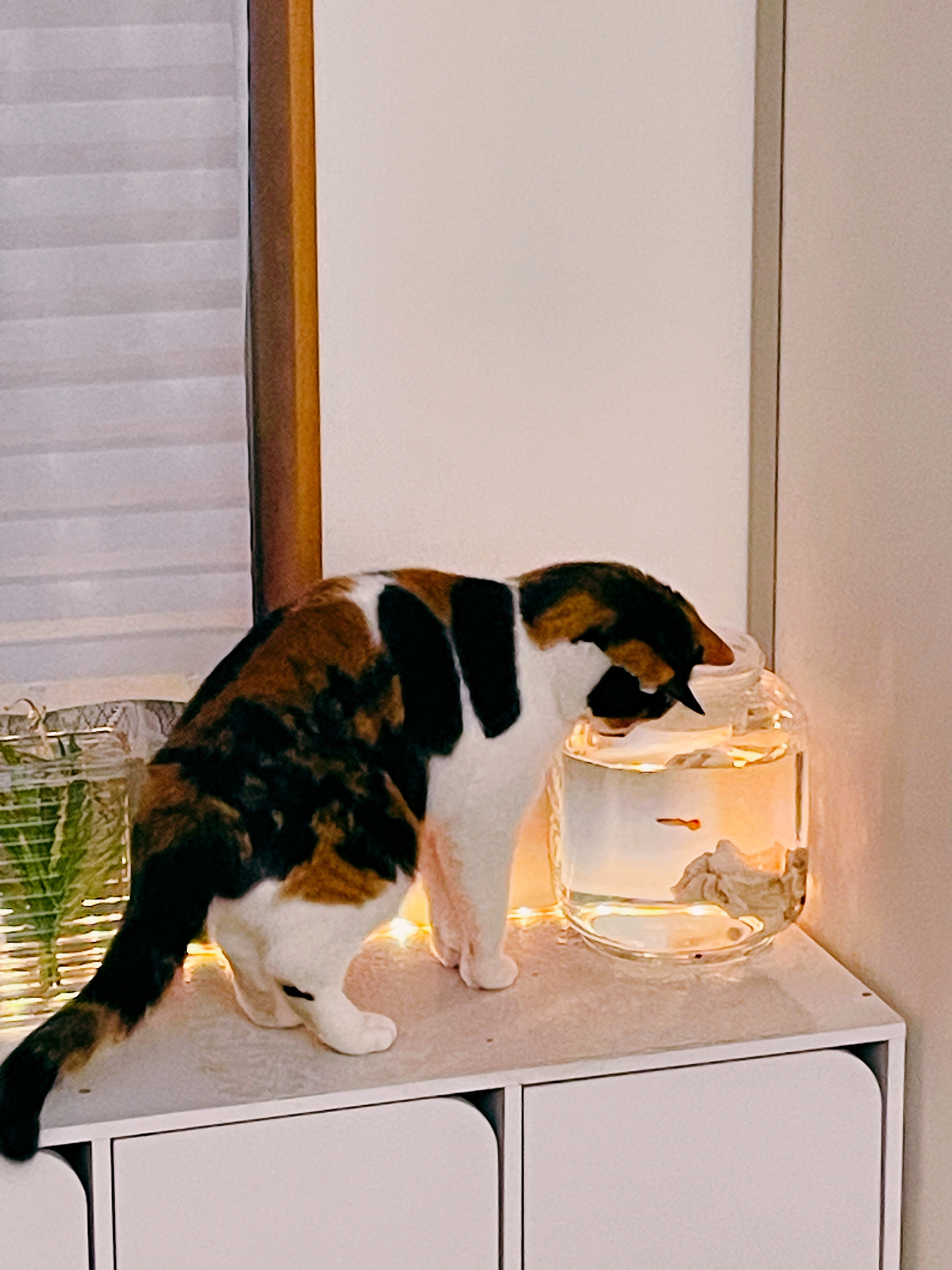 クッキージャーのサイズがコンパクトだけど小さすぎず、テレビ台の端っこに置いて柄のないクリアな部分を正面にして、裏にLEDテープライトなどを置いて。夜ライトアップした時は水槽としてもきれいに見えてて癒されます。お魚の種類はベタやメダカなど酸素ポンプの要らない品種がおすすめします。