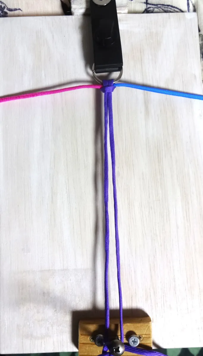 ↓ 縦の軸は50cm程。赤と青は編み込み用。各1mをライタ-で接着。
