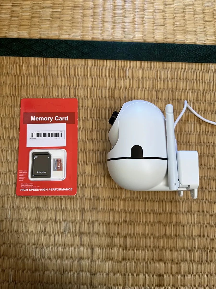 ①セキュリティカメラのアプリをダウンロードし、セキュリティカメラのWi-Fi接続(できるだけ安定している2.4GHzで)をしておく。また記録用のマイクロSD カードも取り付ける。