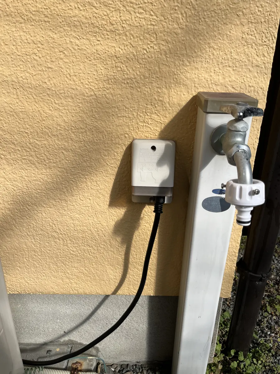 ・このため屋外防水コンセントから延長電源コードを使い、セキュリティカメラから3m以内の位置まで延ばし中継できるようにしました。
