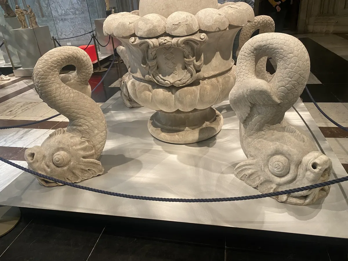 写真は私が気になってしまって案内係に説明を求めた像なんです。1660年頃にドイツ人が寄贈したらしいのですが、足元に4匹の「見たことがあるような内容な物体」がいるんですよ。