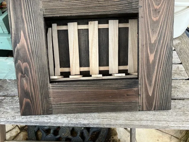 用意するものは、セリア100円ショップで買った桐すのこ。それをフラワーフレームの箱部分に合わせてノコギリで切ったものを配置する。これで、フレーム箱部分の腐敗を防ぐのと通気性、苗ポットの高さ調節ができる。