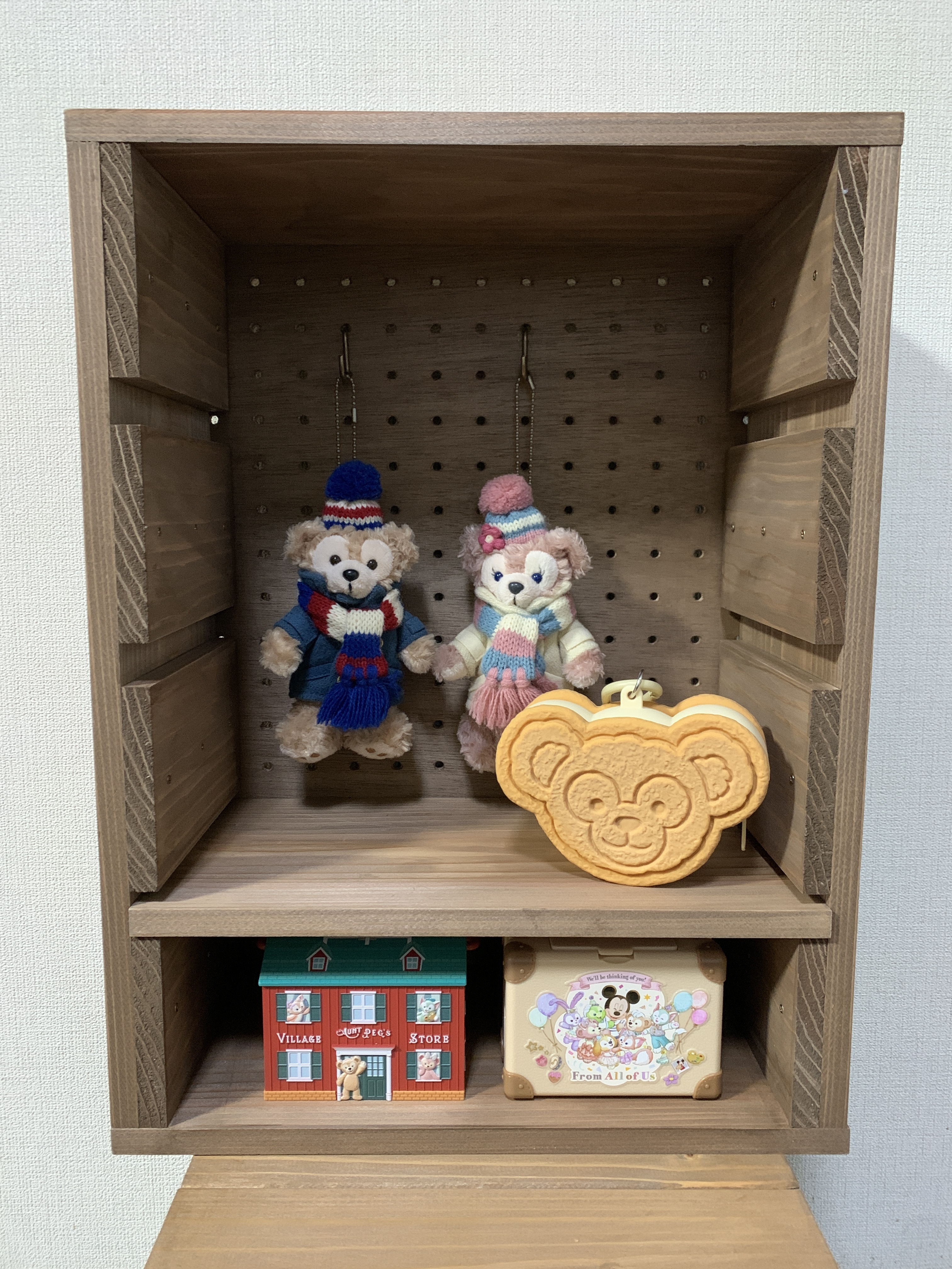 背面が有孔ボードなのでフックをつけて吊すことも出来ます👍とりあえずダッフィー達を吊るしてみました♡