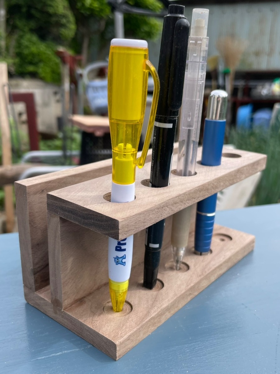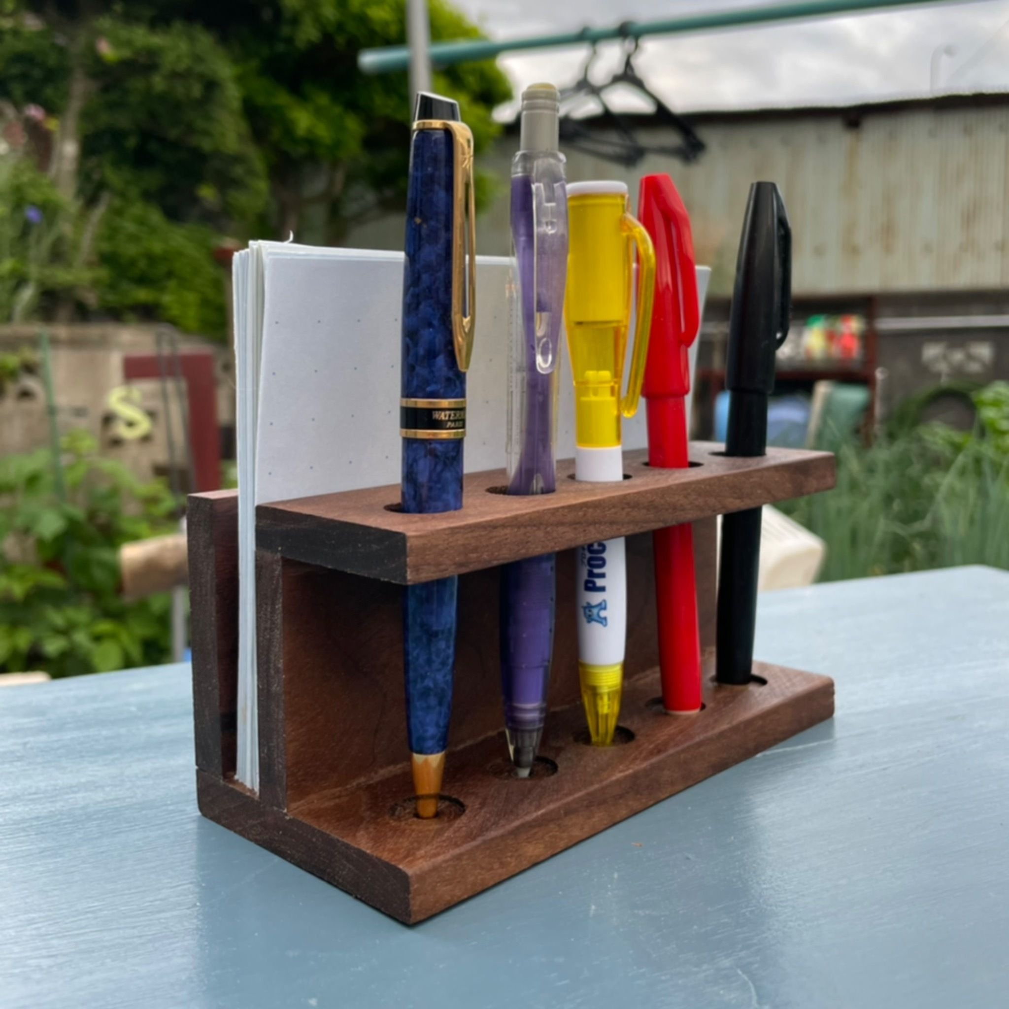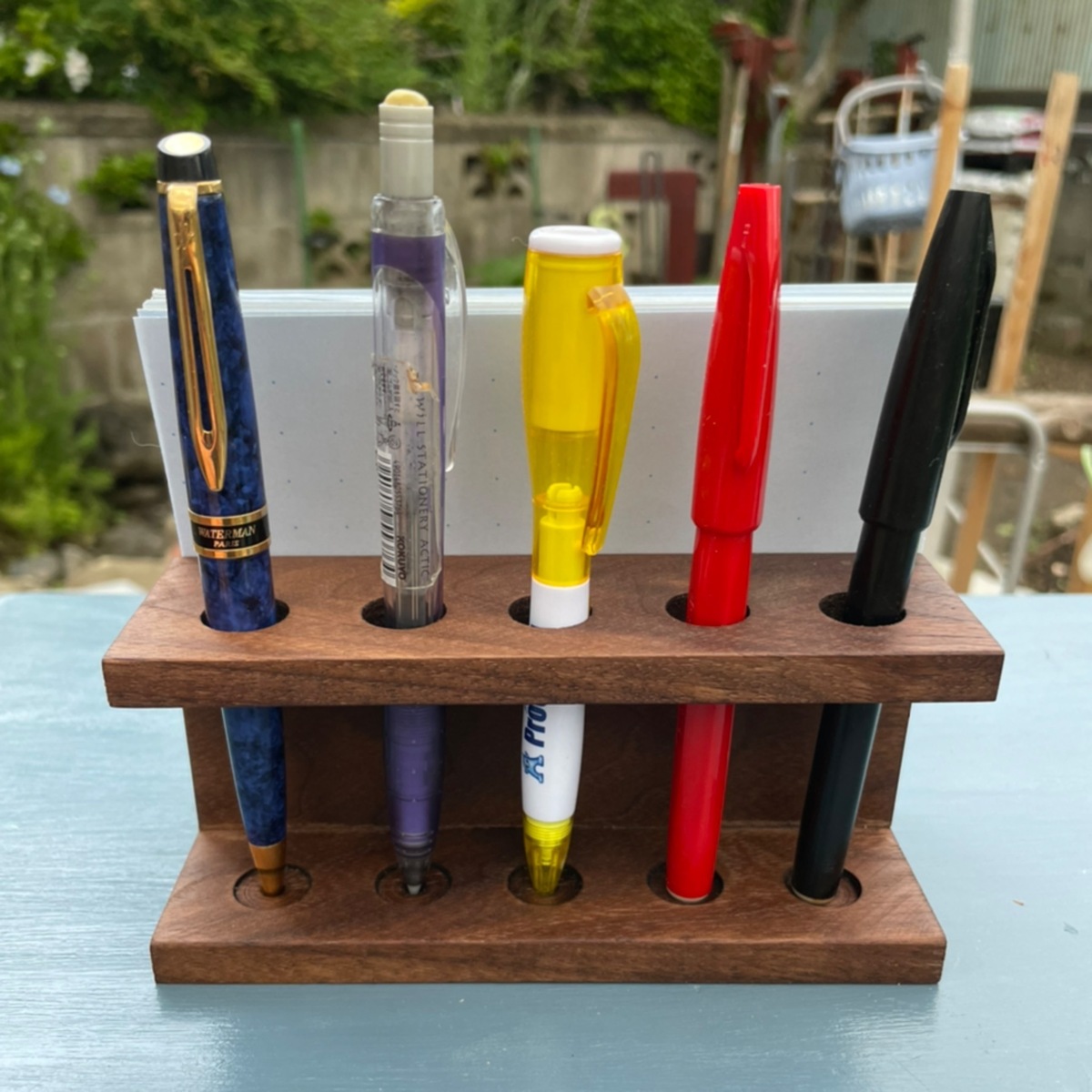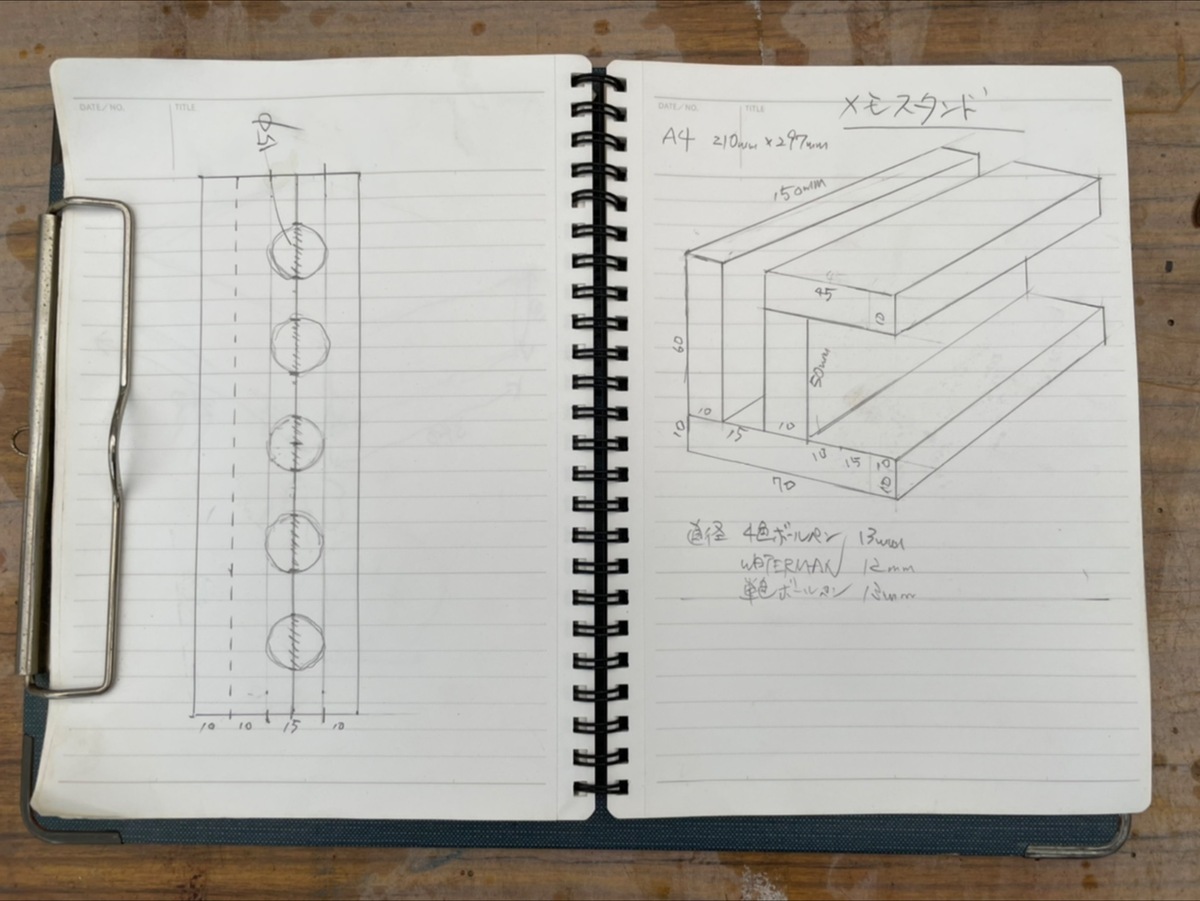 45ミリのは、15ミリ径でペン立て部分を5箇所穴開け。ベースにペン受けとして2ミリ程掘り下げます。