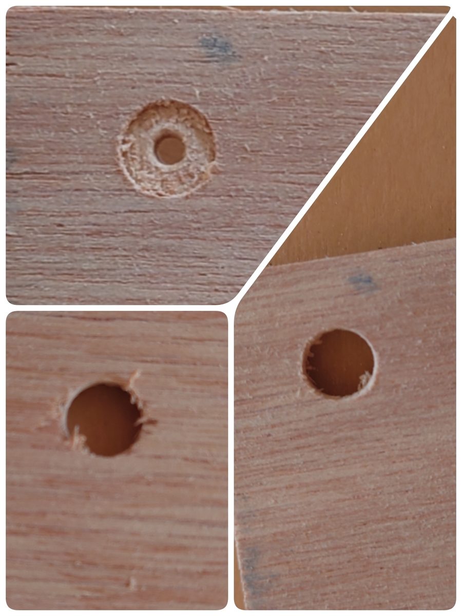 裏返しして穴をあける(穴が貫通する時に板が浮いちゃうとバリが出るのでしっかり押さえる)とバリが少ないそうです(写真右と下)