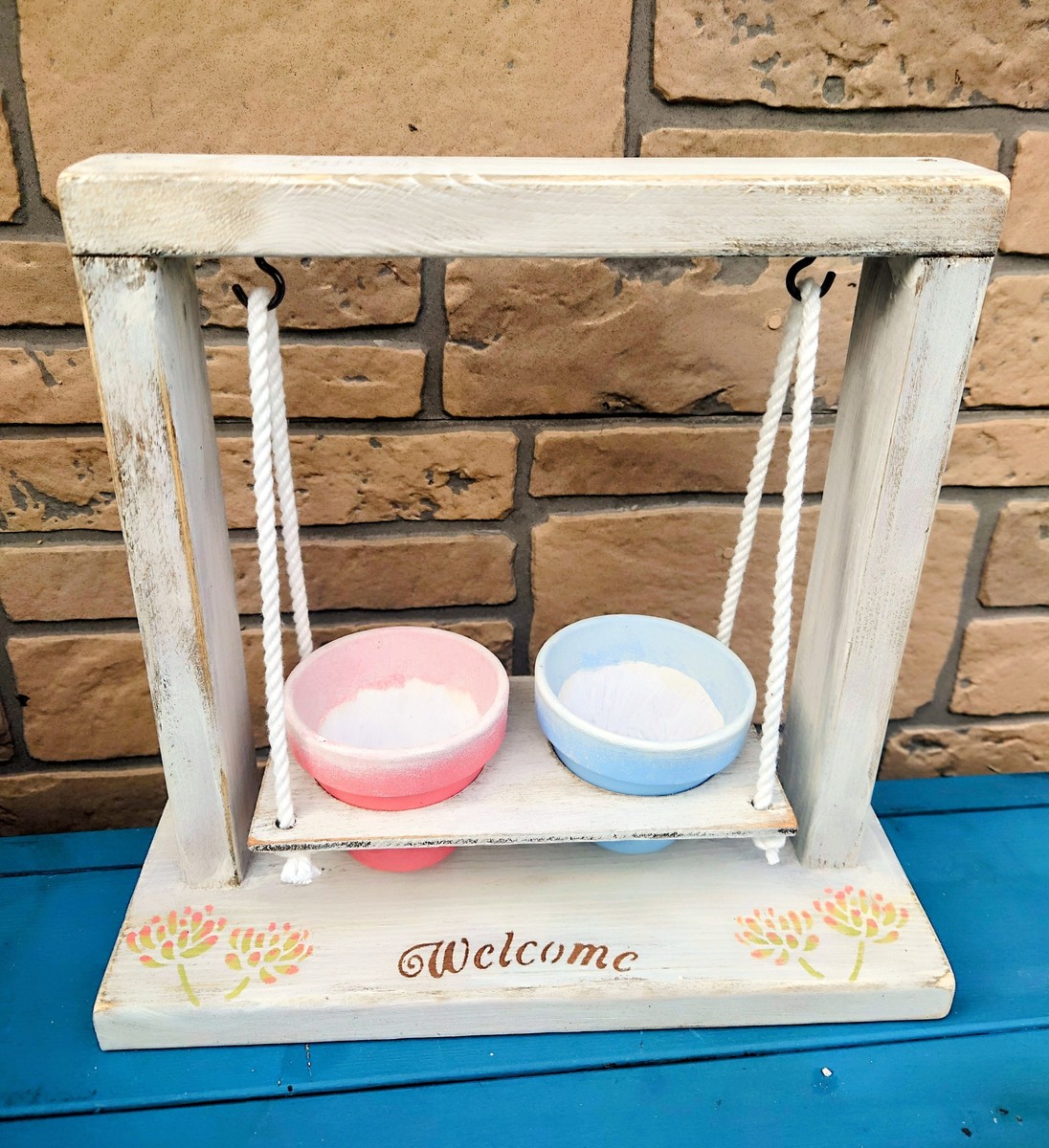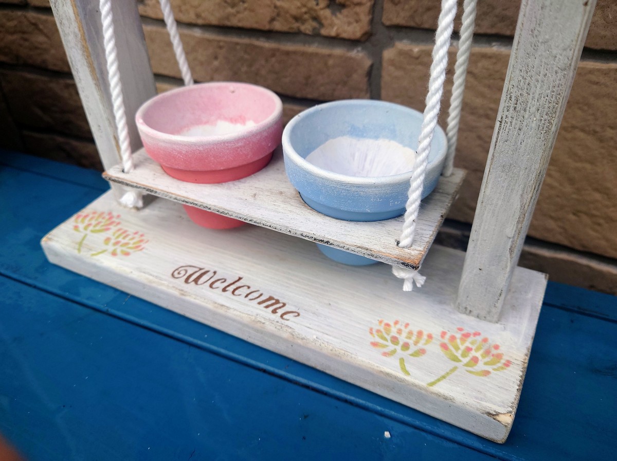 投稿を表示ブランコ風の可愛い鉢置きですね、塗装も、ステンシルもいいですね~ブランコの大きな◯◯2つの穴開けは、何を使って開けてるんでしょう?