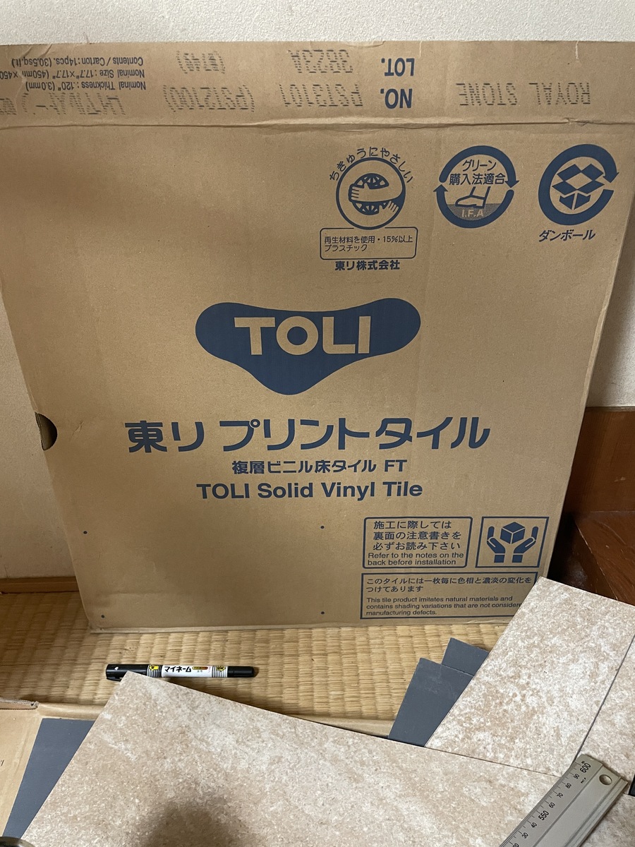クッションフロアだとツルツルして滑りやすくなるし少しやだなーと思ってましたがプリントタイルなる物を発見しヤフオクでコレまた格安で購入出来たのでコレを使います!