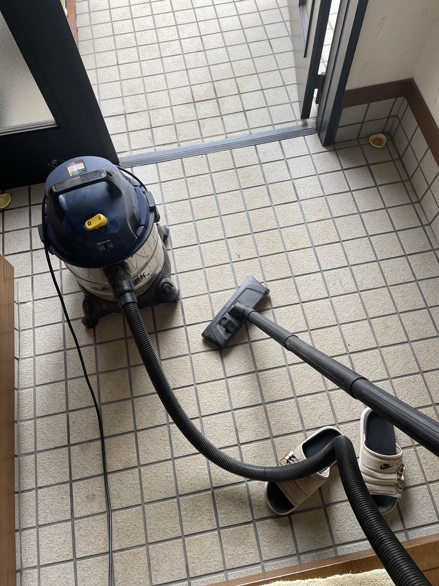 施工前のお掃除です。始めはホウキで掃き掃除してましたが、掃除機で一気にやっちゃいましょー