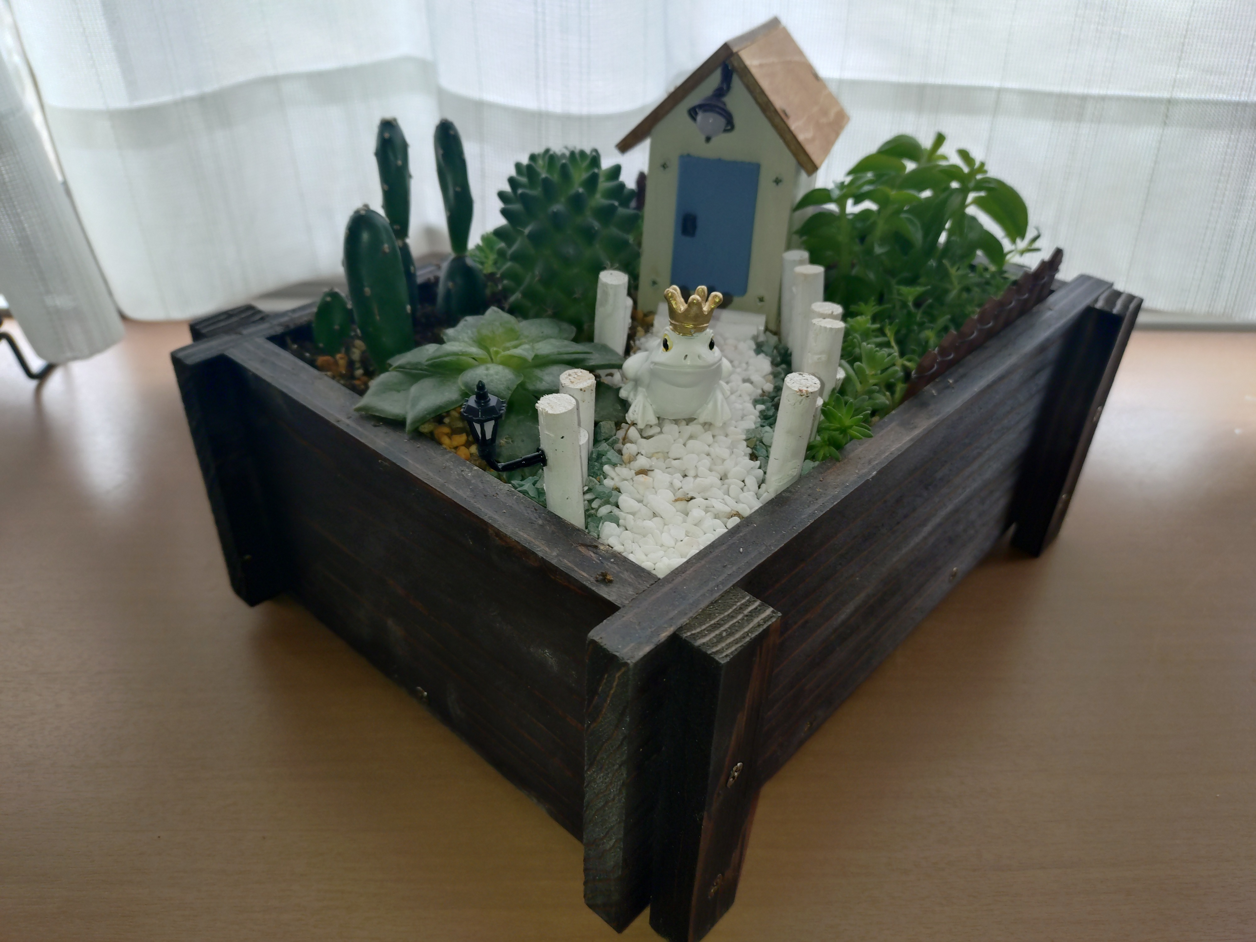 針金とビーズでライトを作り、うちにいたサボテン2種足して、使えずにいたカエルの王様を鎮座して😄