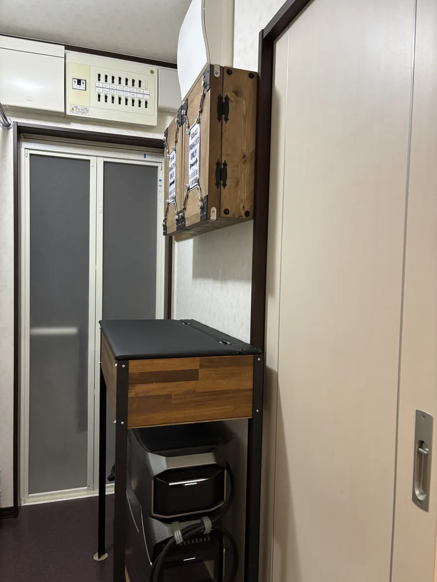 脱衣所に壁面収納がありましたが蓄電池を設置する為に脚付き収納を作ったけど収納しきれず追加でつくりました😊