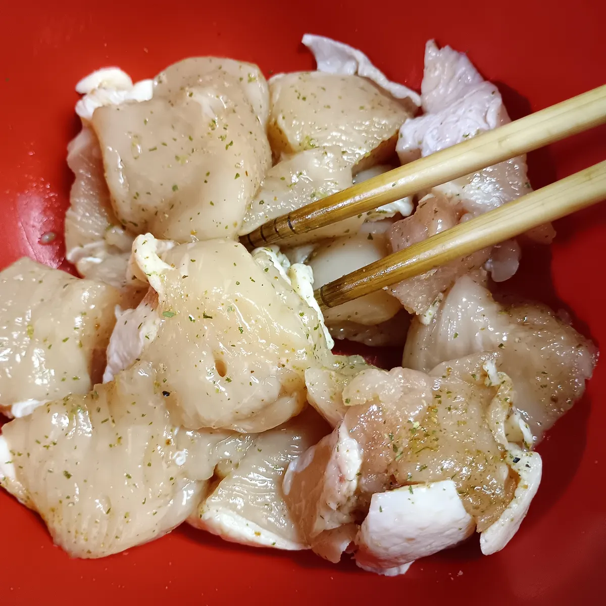 果肉はトロトロなので鶏肉に絡め、皮は固いのでポイッ(-_- )ノ⌒(フレッシュレモンなら柔らかいかも)