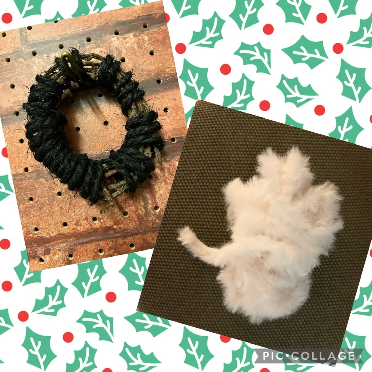 こんないい加減な土台ももふもふ毛糸で大変身あとは100均の羽やら木の実風の飾りやらをグルーガンでくっつけて、最後にリボンをいい感じになるように配置したら出来上がりです。