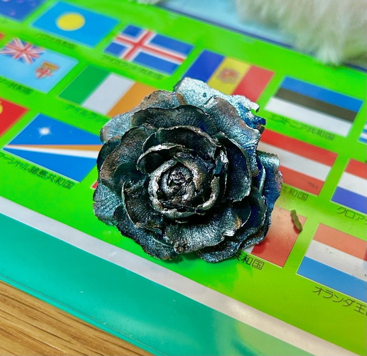 先日シダーローズに赤のスプレーを吹いた時に、実は面白半分で1個だけメタリック調のシダーローズを作ったんですよ。