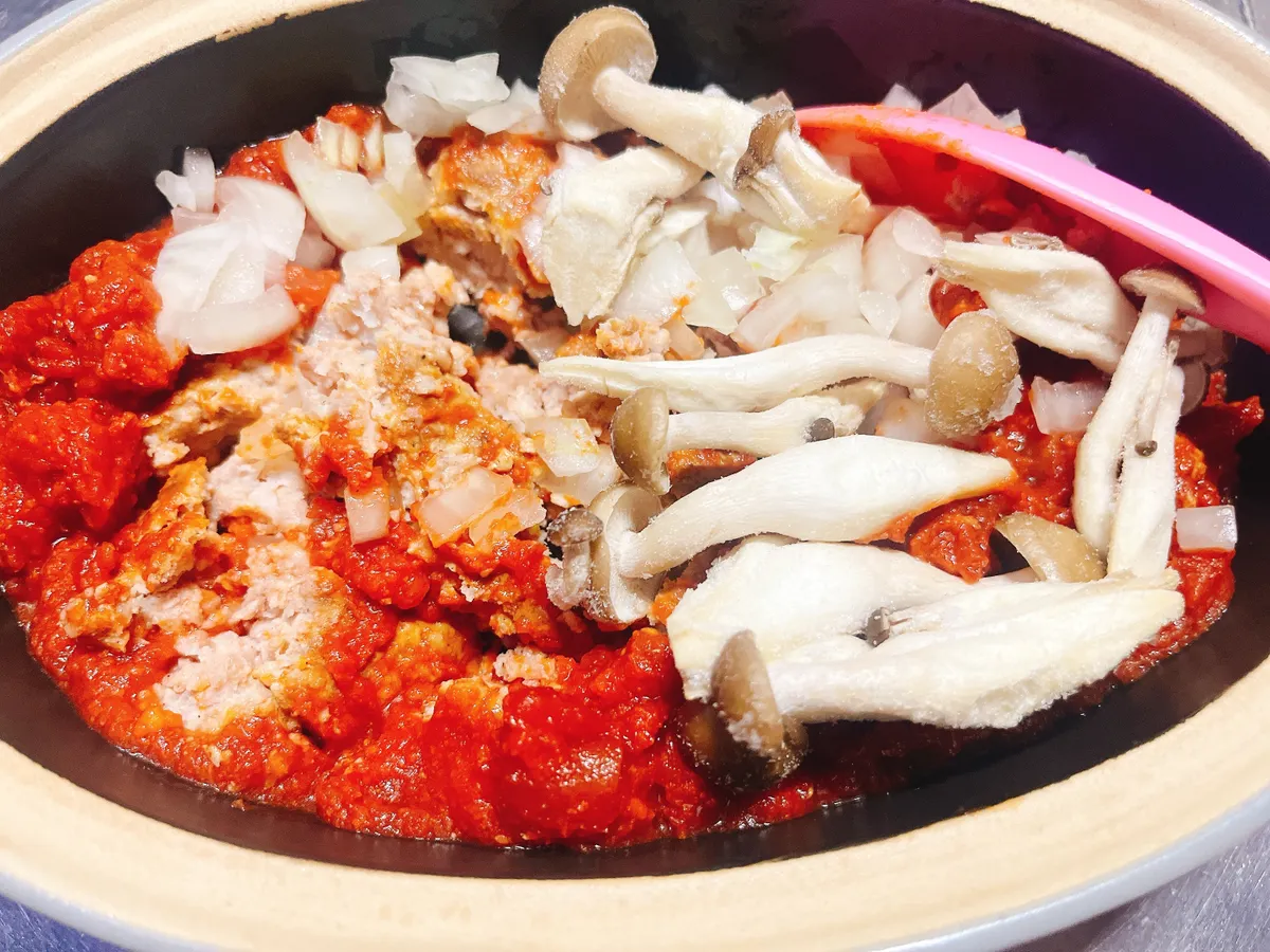玉ねぎをみじん切りにし、冷凍してたしめじと一緒にパスタポットへ入れます。