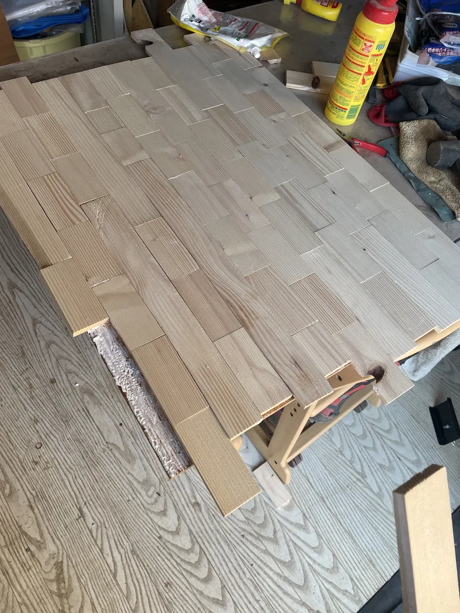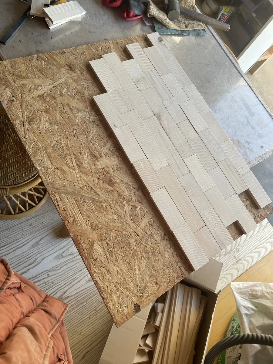 木工用ボンドを塗布したOSB合板にかまぼこ板をひたすら置いて良い感じの大きさでカットするだけ