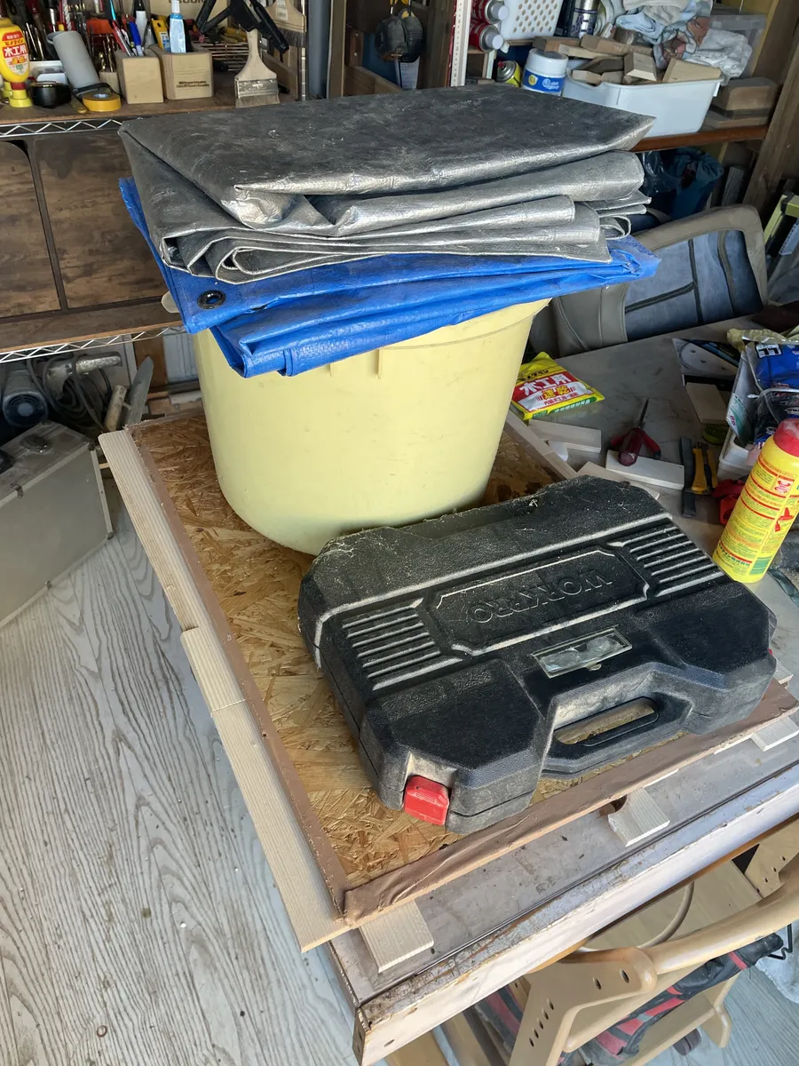 屋外で使用するので防水対策はコレでと考えてましたが。会社のデスクマットを貰ってきた物ですが、ん。。。どーでしょー