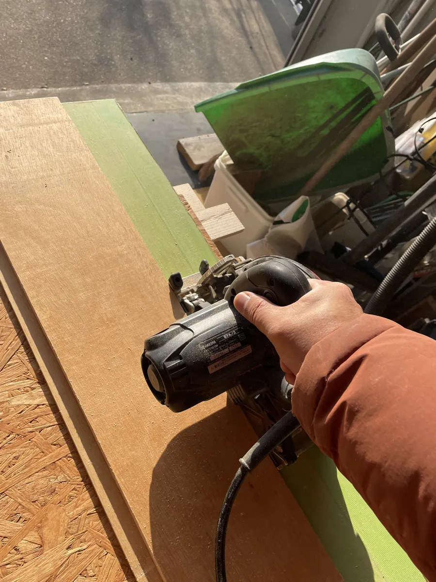 サンダー掛けが終わったら天板を裏返して余分な所をカットして行きます。