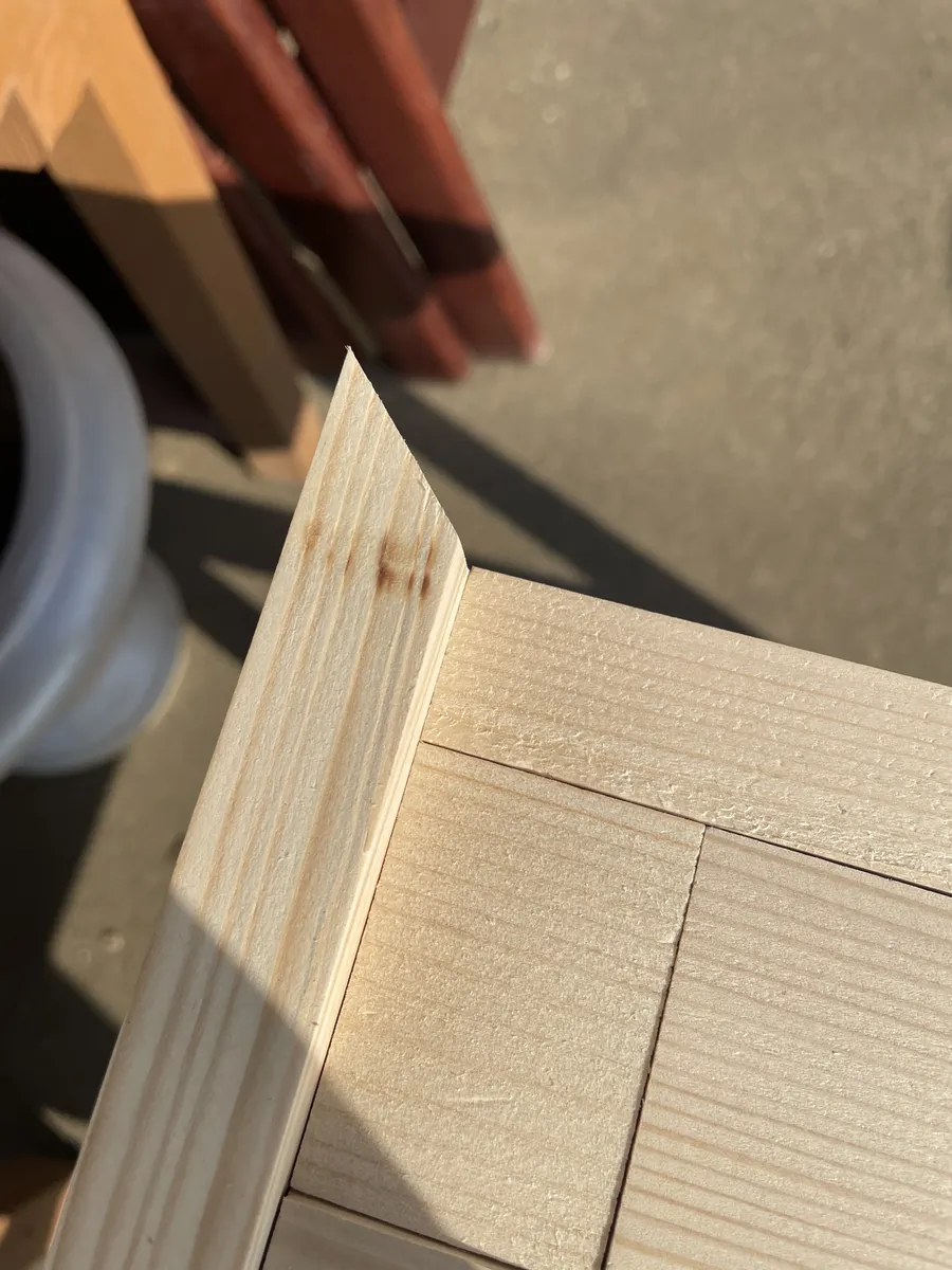 縁取りは当初トメの45度で考えてましたが後で角を取るので方法を少し変えて取り付けしました。出来上がったら再度240番の紙やすりでシャカシャカします。