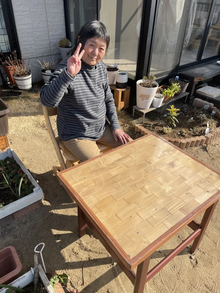 湯婆婆さんのお庭のテーブルが完成しましたよー♪♪♪今回は初の顔出しで登場して頂きましょー、一応🉑許可は取ってますが多分良くわかって無いハズ🤭