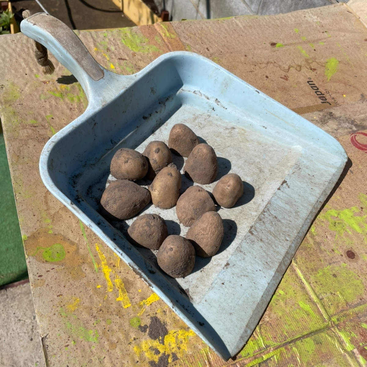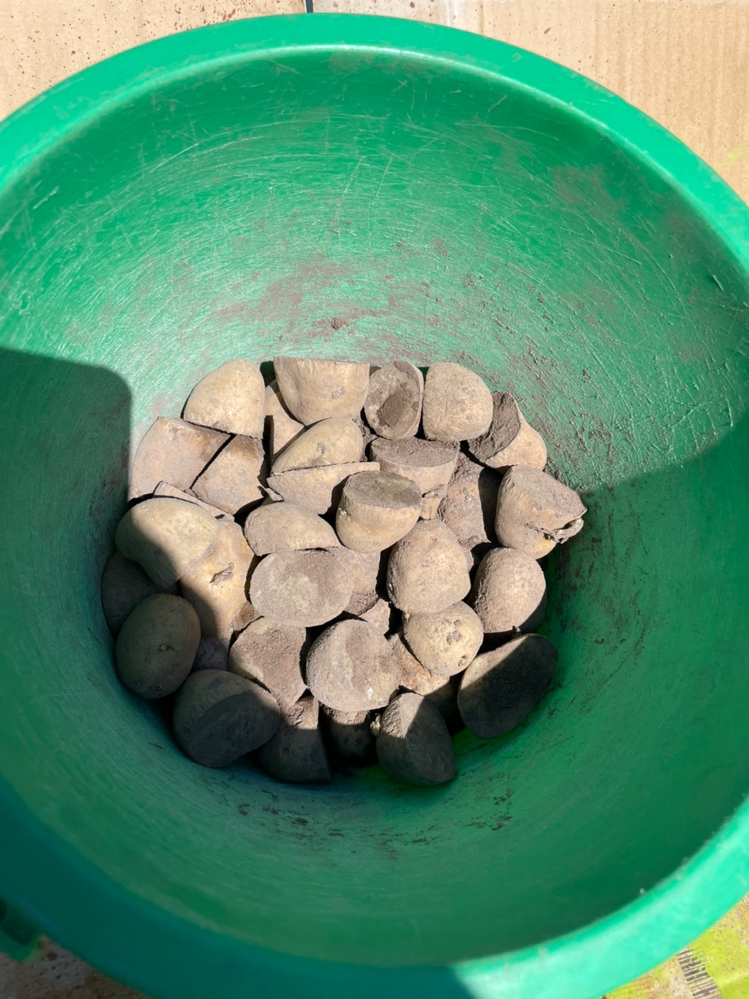 アイキャッチ画像は、植え付け前日に種イモをカットして草木灰をまぶしておいたモノです。