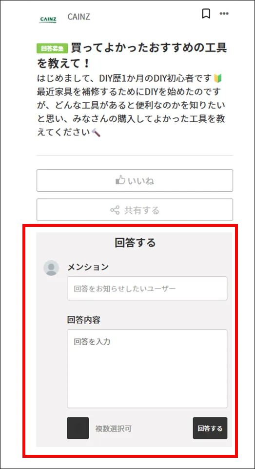 ①「回答募集」と表示されている回答したい質問を選択、回答内容を入力し「回答する」ボタンをタップ