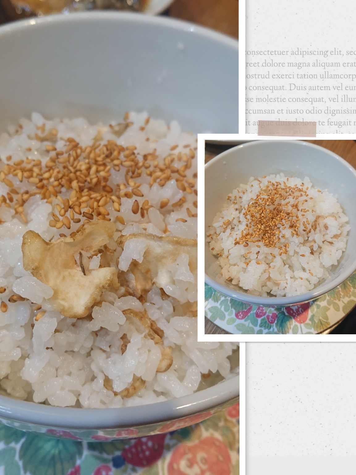 金✨×2で健康になれるとうれしいナ、のごはん♪です。少し柔らかめに炊いたごはんに、金の菊芋チップスを混ぜ込み、金ごまをふりかけました😋