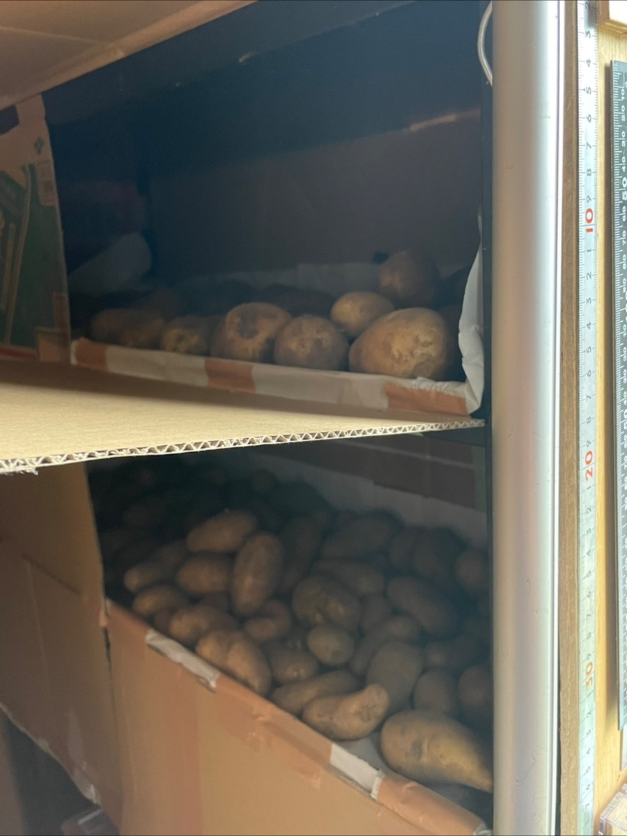 ↑半日天日干しして、昨年作った物置き内のジャガイモ保管場所の棚(リンク→ https://diy-square.cainz.com/announcements/8f1jww66fhdq6pkn )に移動しました。2段で足りました。