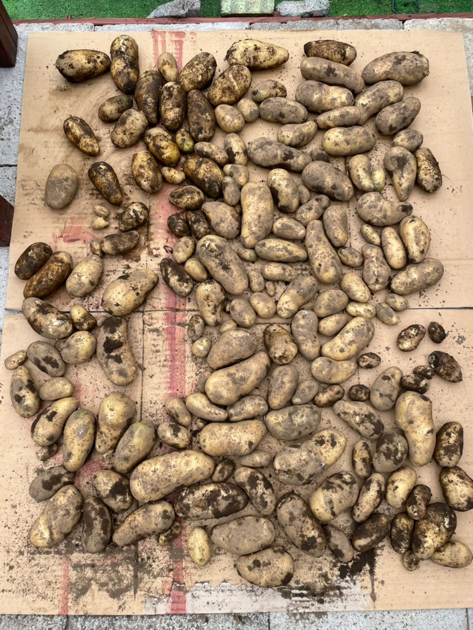 梅雨の隙間を狙っての収穫です。3月14日投稿(リンク→ https://diy-square.cainz.com/announcements/lnp9slecov674lcw )の種イモ植えから3ヶ月足らず、一般的には100日が目安らしいんですが、雨だと何にも出来なくなるんで。