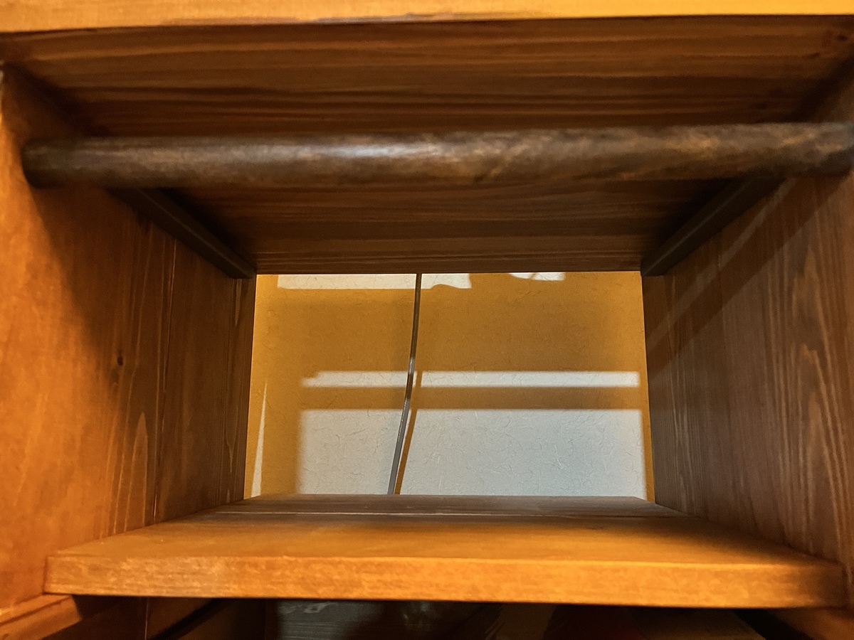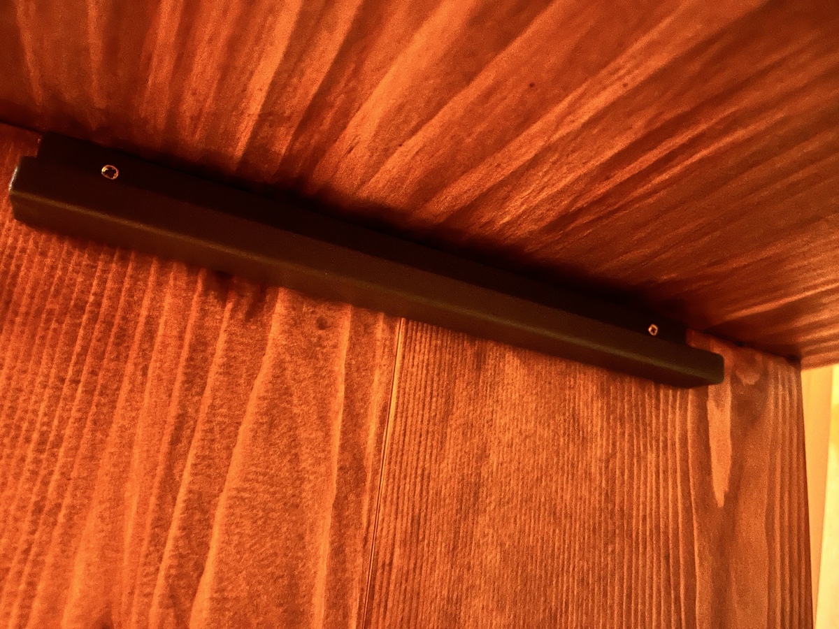 そして、まず直面したのはどうやって扉をぶら下げるのか。ネットで調べると幾つも方法があったのですが、その中でも横棒を使って、そこに引っ掛ける方法を採用しました。