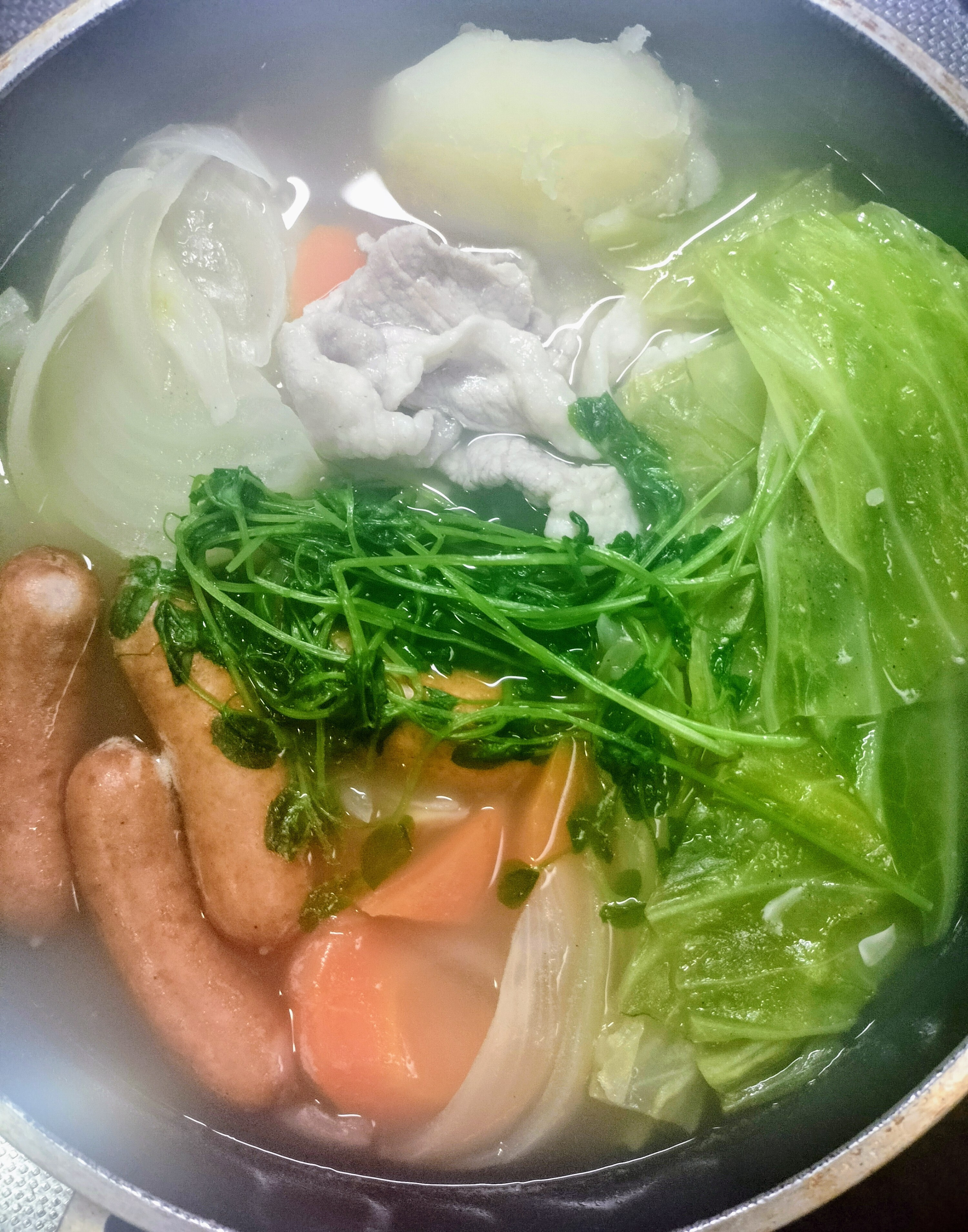 湯気の感じとかもう美味しそうです🤤薄味派なので、薄味良いですよね。野菜の味がよくわかるし、ベーコンやウィンナーって塩分や旨味があるので、それが入ると十分ですよね😃